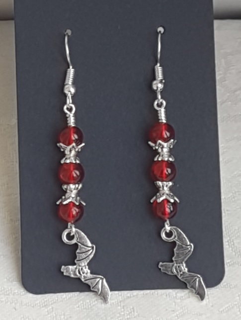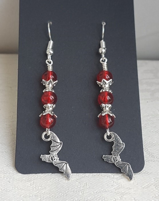 Cute flappy bats and blood red beads make these earrings fang-tastic. A great gift or an unusual addition to your Halloween costume.