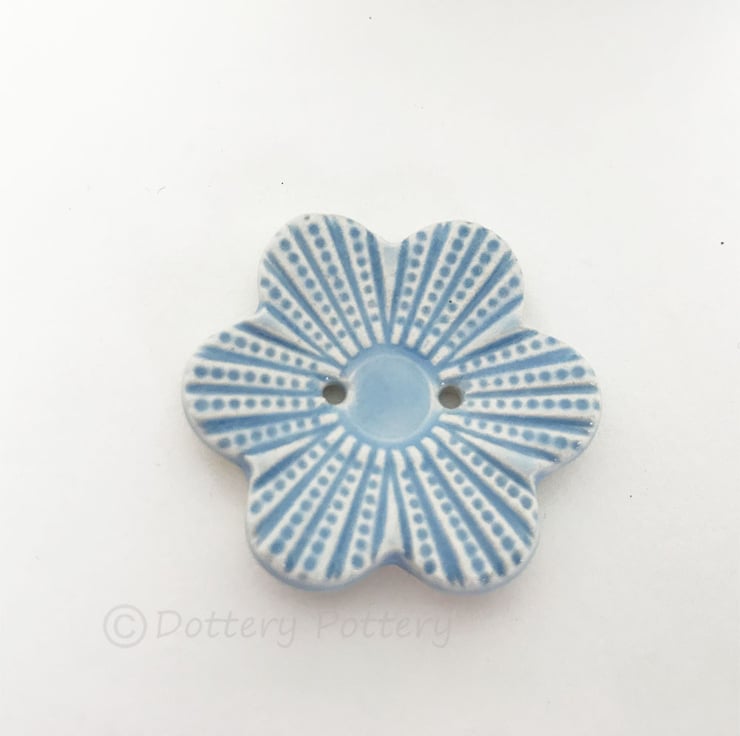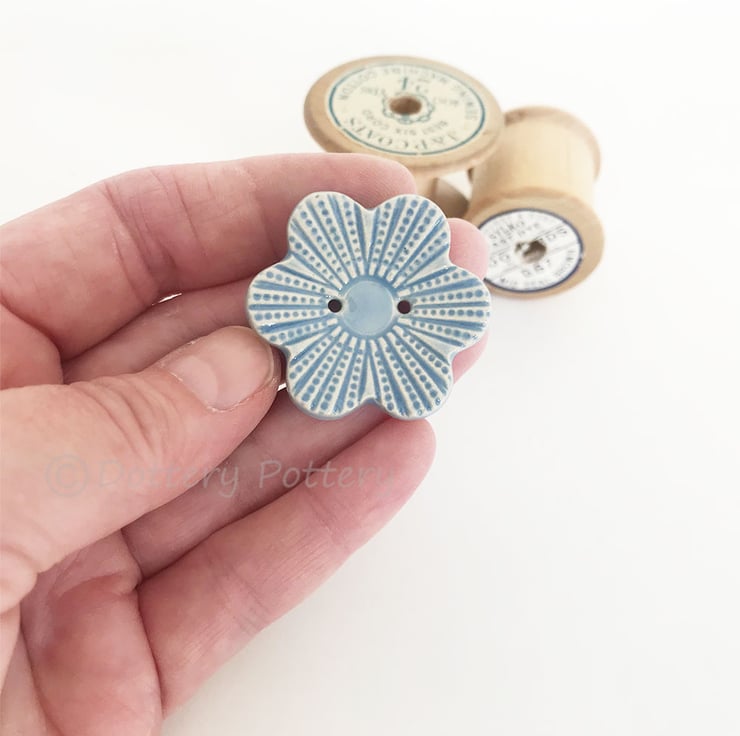 This large pottery button is made from white earthenware clay, embossed and glazed on the front. It is then fired to 1100 degrees, so nice and strong. It measures 4cm x 3.5cm.They can be handwashed or machine washed on a low temperature. Perfect for all sorts of arts and craft projects.