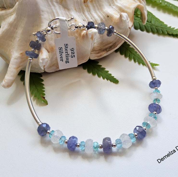 The item consists of 15.05cts of AA grade tanzanite large faceted rondelles complimented with 5.25cts of white moonstone from St . Lanka and 2.95cts AA Grade apatite rondelle cut gemstone beads. All outer components are quality heavy weight sterling silver.