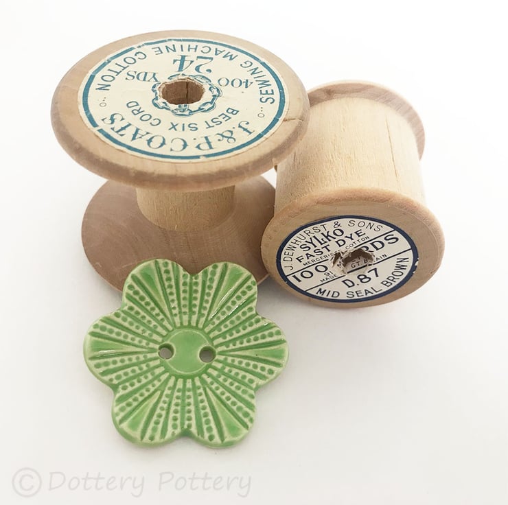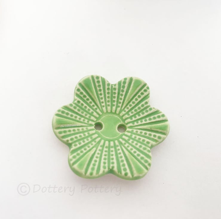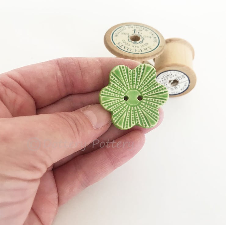 This large pottery button is made from white earthenware clay, embossed and glazed on the front. It is then fired to 1100 degrees, so nice and strong. It measures 4cm x 3.5cm.They can be handwashed or machine washed on a low temperature. Perfect for all sorts of arts and craft projects.