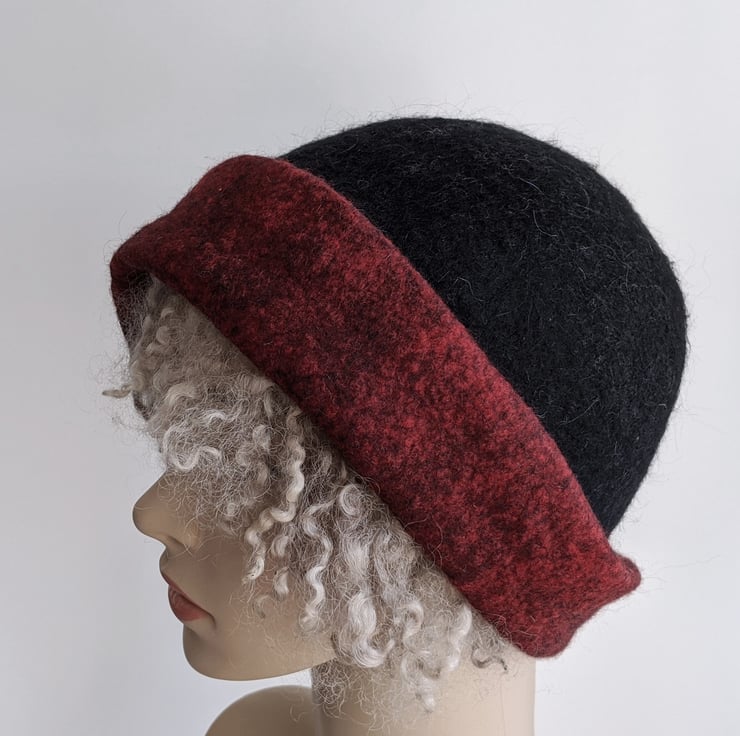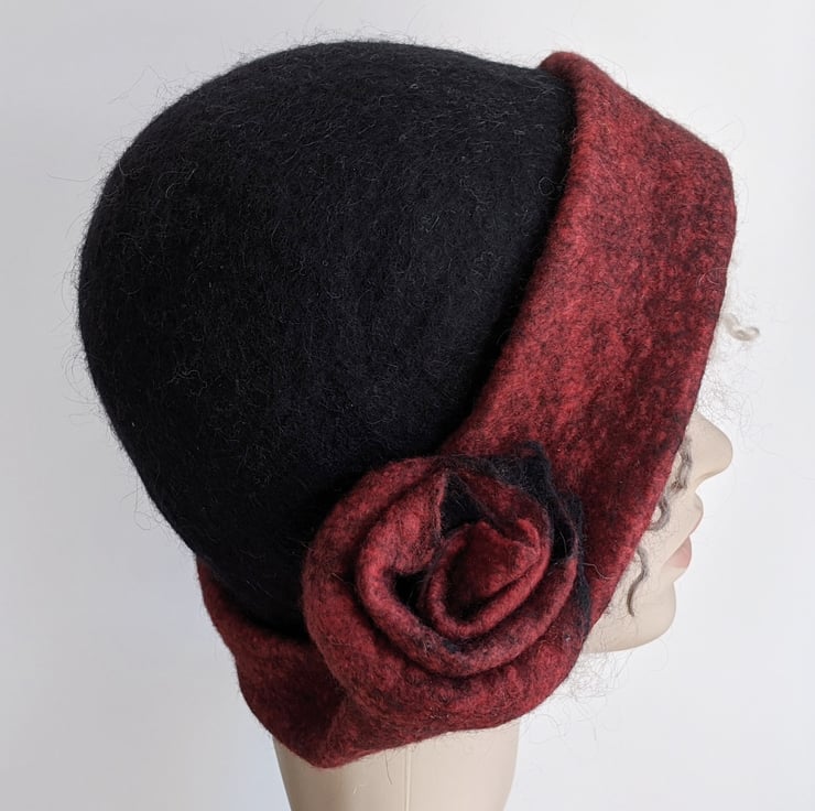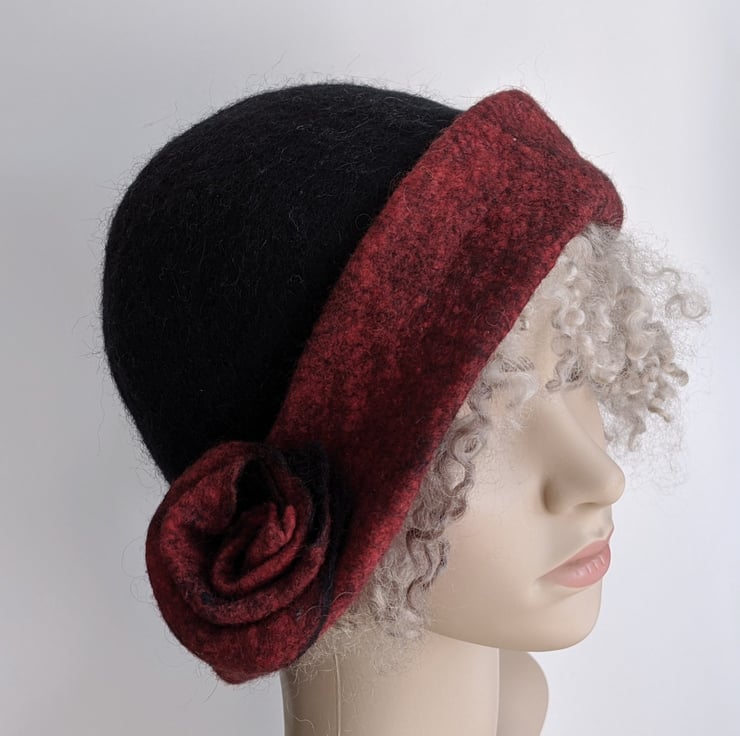 Handmade wet felted black and deep red merino wool cloche hat. A sweet feminine vintage style, with an asymmetrical brim and a matching flower.