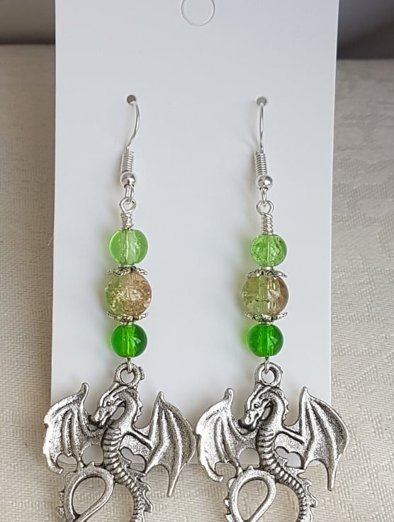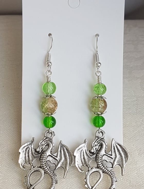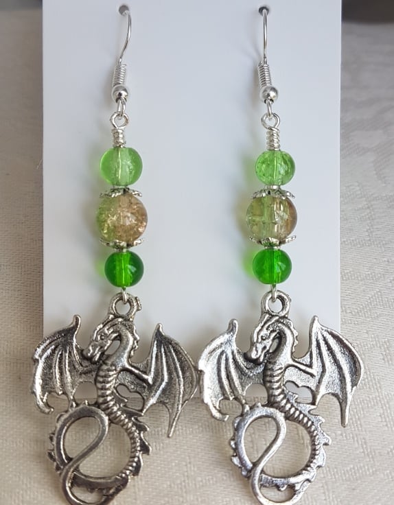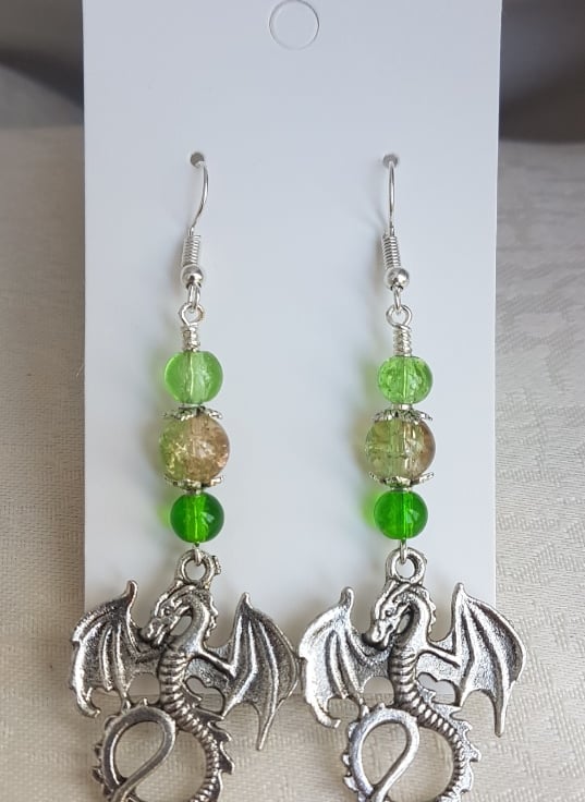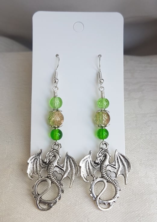 Gorgeous dragon charm earrings representing one of the four natural elements, Earth. The green beads represent everything lush, green and earthly. Elemental Earth Dragons (Draco Terrae) are the protectors of Mother Earth and are most at home in the vast forests and mountain ranges. They represent nature, wealth and creativity. They also represent North on the compass, Winter and Midnight.