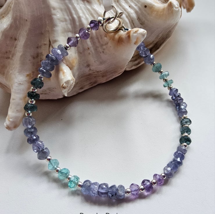 The item has a 17ct mix of quality grade A tanzanite, amethyst, teal green rare kyanite and apatite. Within the design are 2mm sterling silver beads for added sparkle. For the main construction heavy weight professional coated stainless steel jewellers wire has been used for added strength and lasting durability, finished off with a 7mm bolt ring clasp, closed jump ring and crimp bead covers.