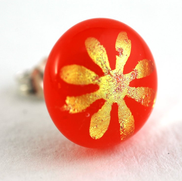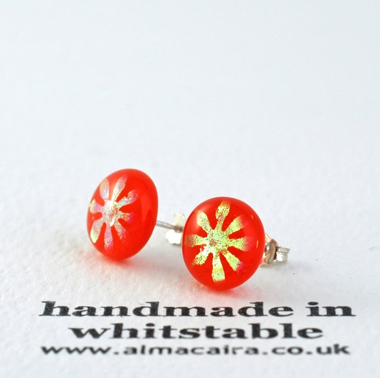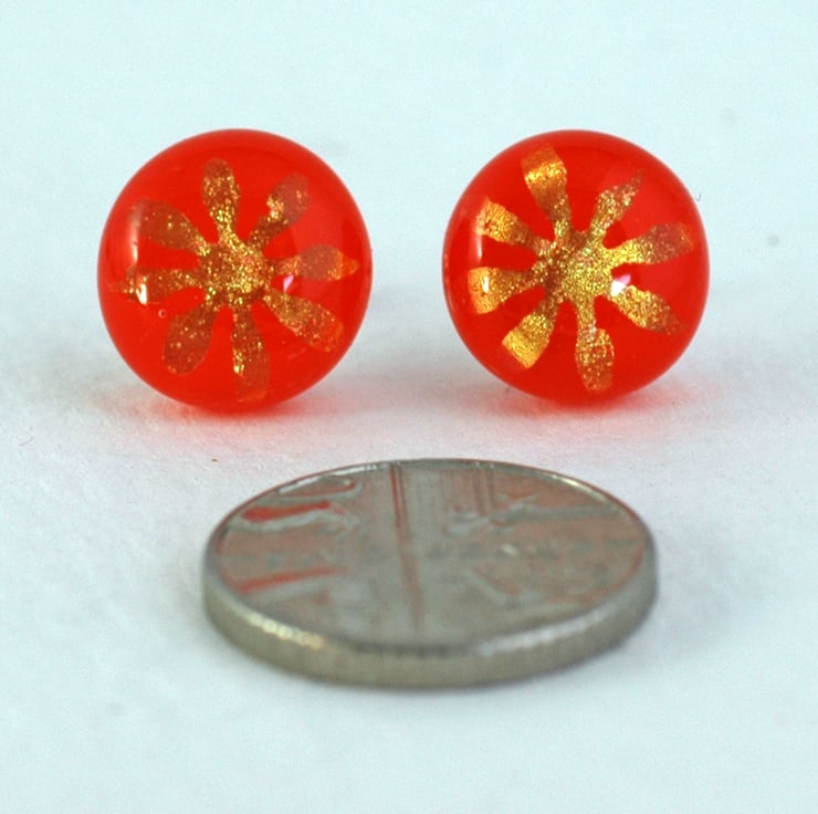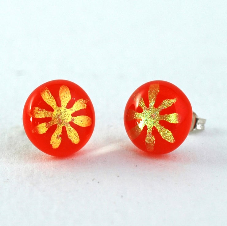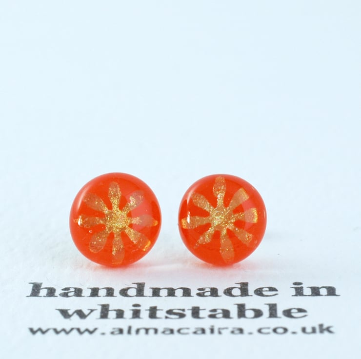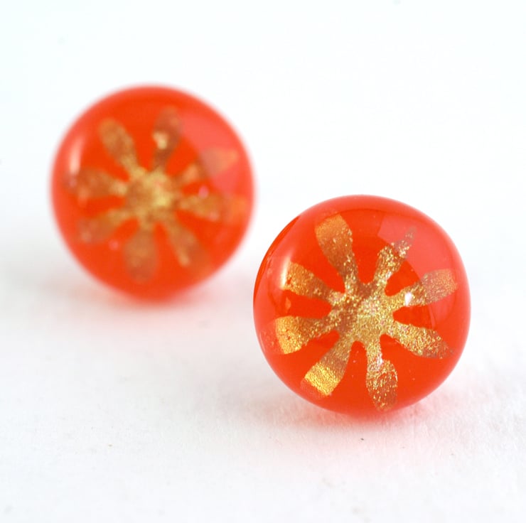 Bright orange fused glass stud earrings with gold dichroic flowers.