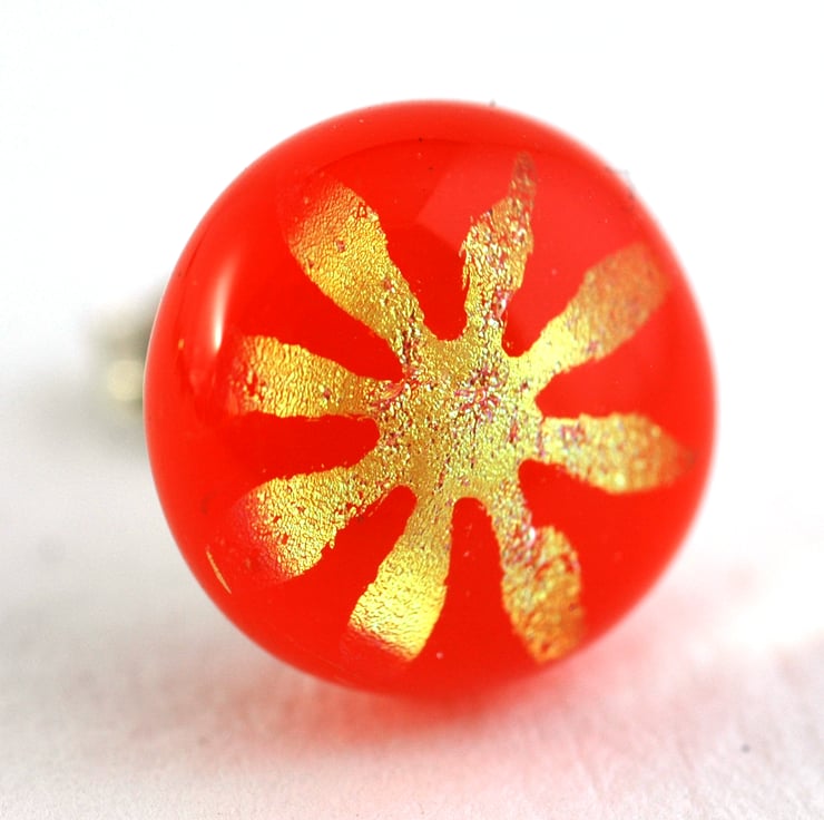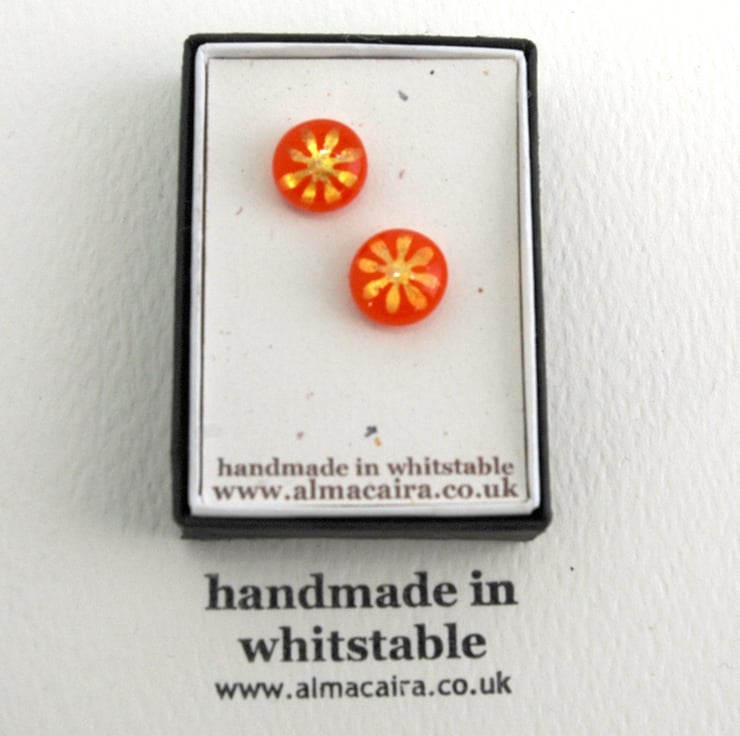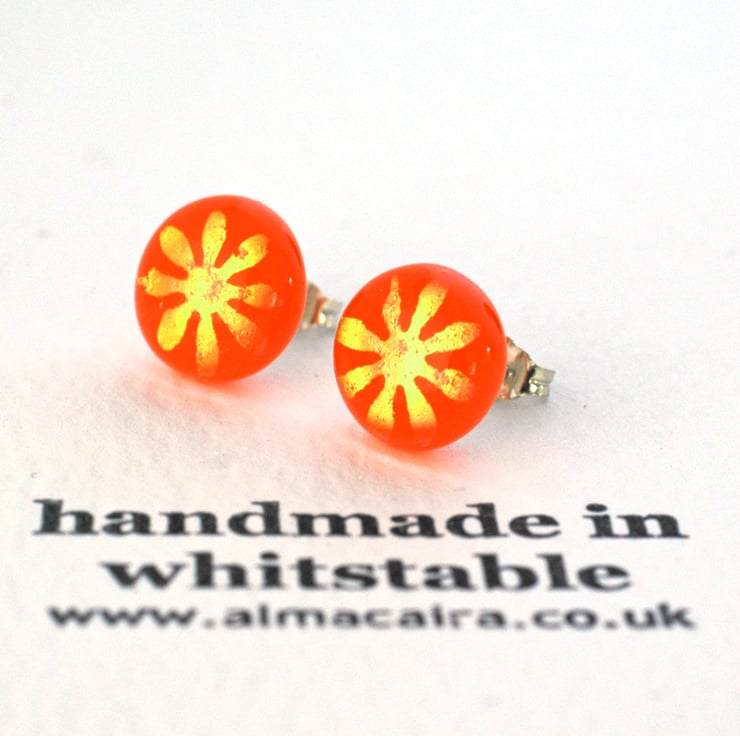 Created from layered Bullseye glass in my Whitstable workshop. Sterling silver ear posts. These earrings are a stunning bright orange and the gold flowers just glitter and shine in different lighting conditions.