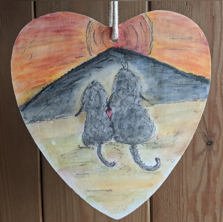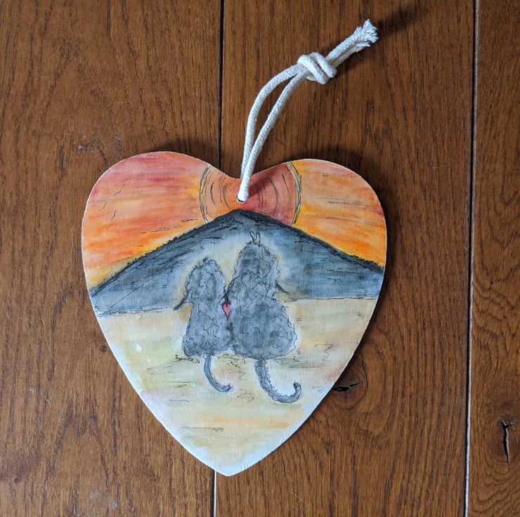 A hanging heart, has been hand painted (not printed or transferred) in Indian Ink and watercolour. It has been painted in an illustrative style. It depicts two Bedlington Terrier Dogs, sitting in front of a sunset over a mountain. There is also a little red heart in between them.