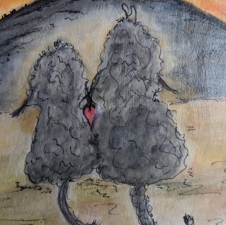 This is inspired by my Bedlington Terrier dogs, Grace and Summer. They are the best of friends, and one always follows the other when you shout them. This painting came from the love they have for each other, and I for them