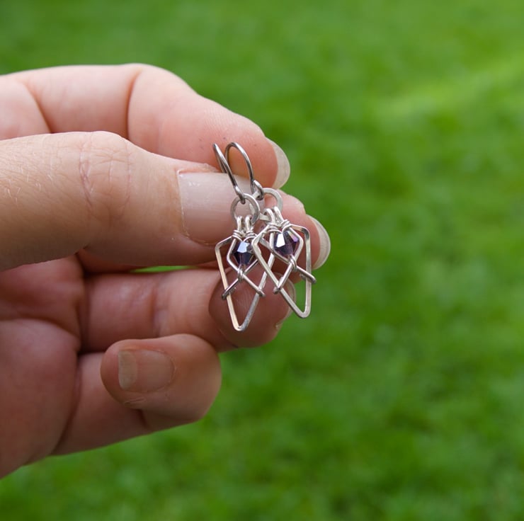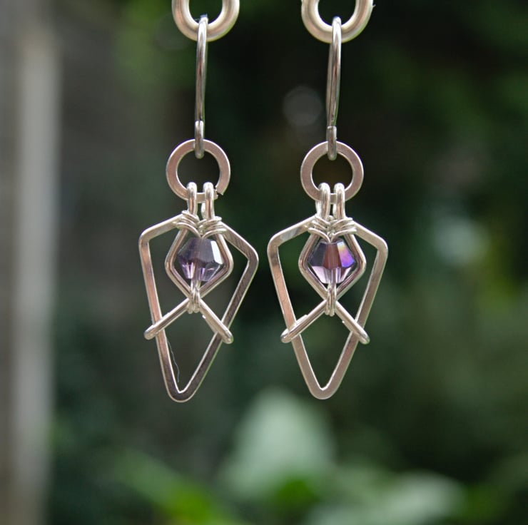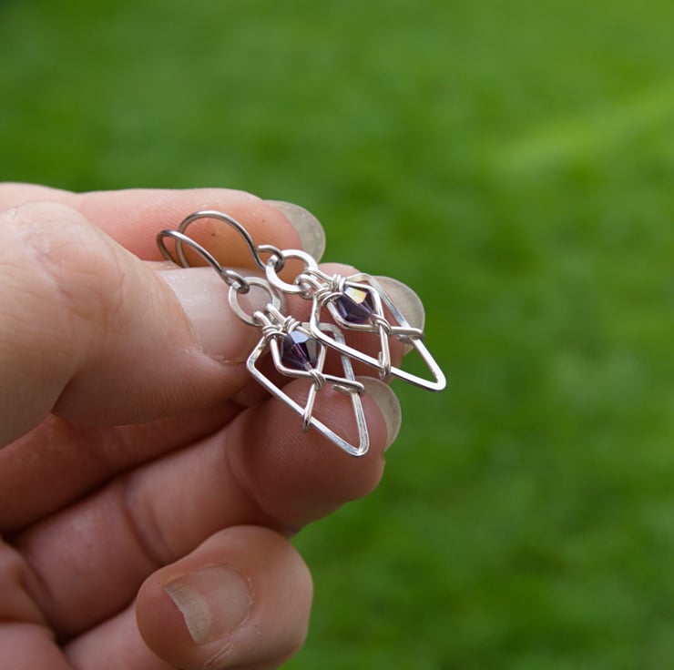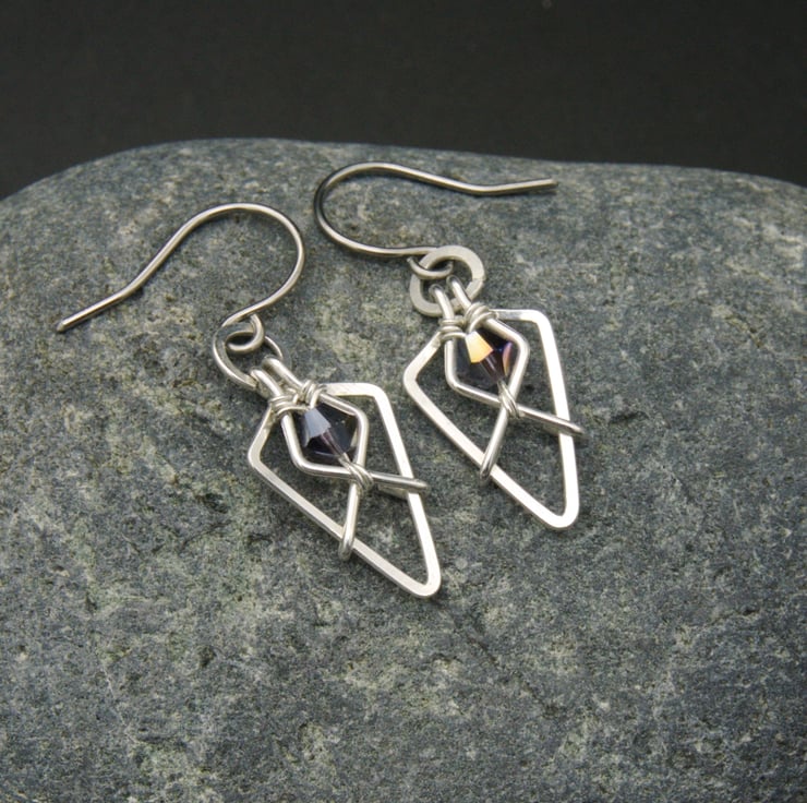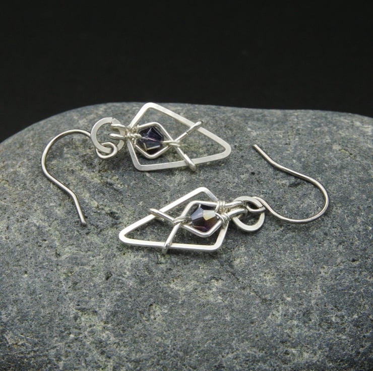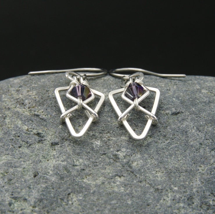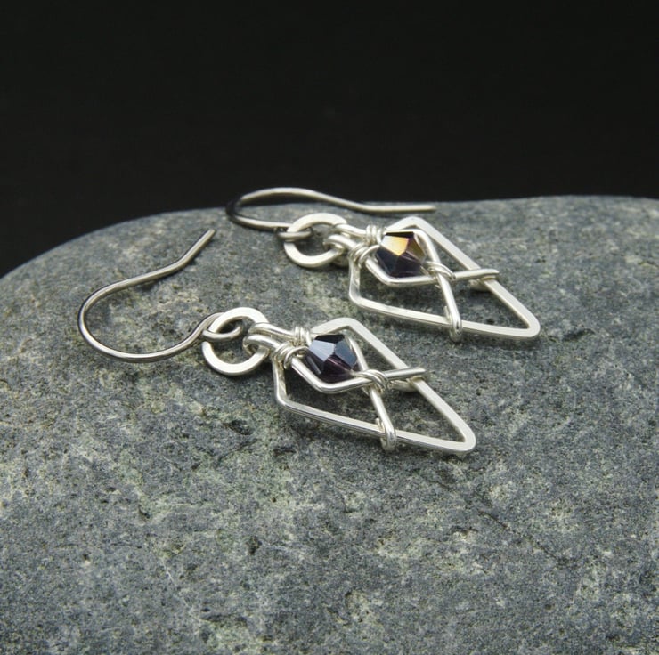 These fabulous drop earrings have been handmade from lengths of sterling silver wire & feature dark purple glass beads. First, I've formed arrowhead shapes which have been hammered flat. The wire tails create a square frame on the front of the earrings, within which I have woven 4mm bicone beads. The dark purple beads have a partial AB finish, giving them an unusual metallic shimmer as the light catches the facets.