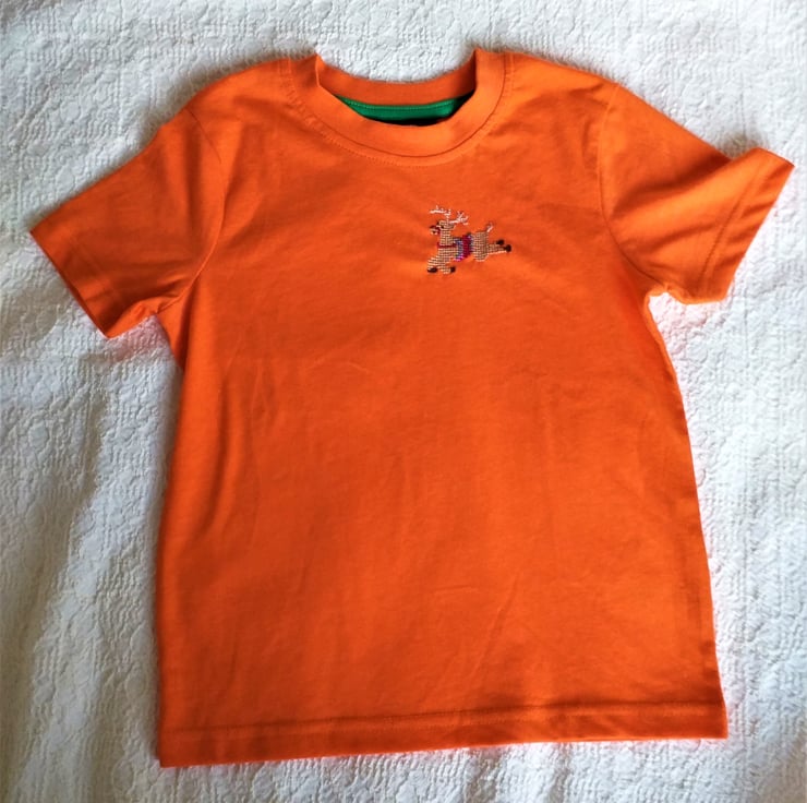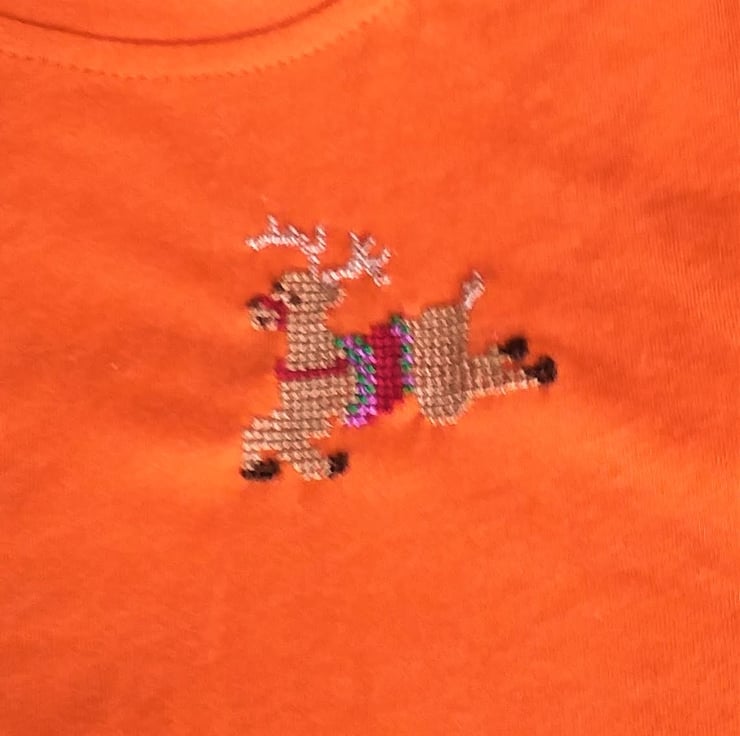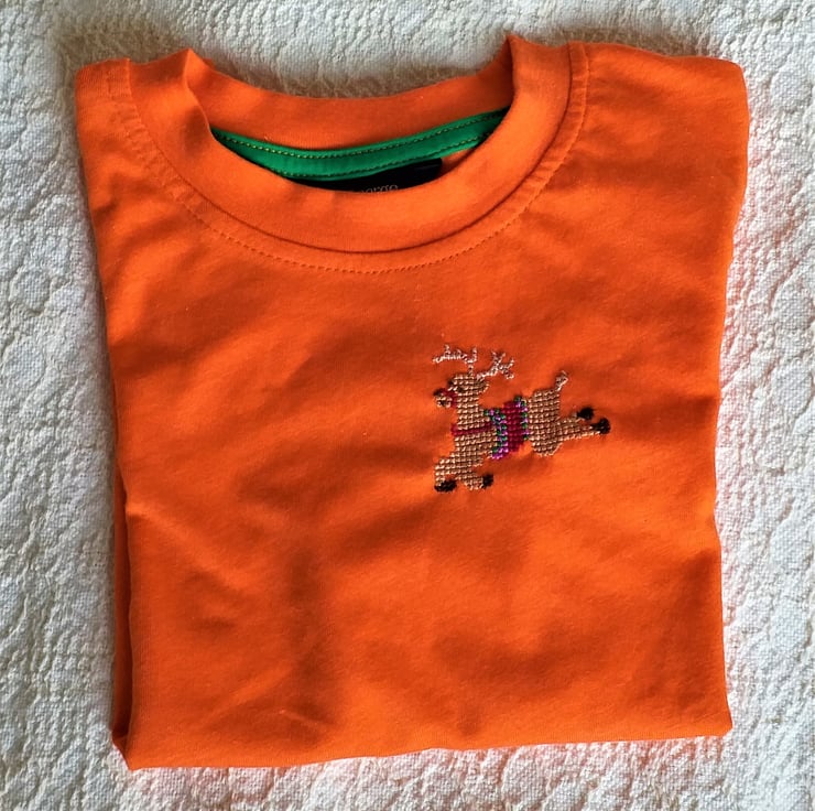 A reindeer is for life, not just for Christmas. I have hand embroidered a leaping reindeer on the left breast of this bright orange, short-sleeved T-shirt. He wears a red, emerald green and violet saddle and red bridle. The shirt is cotton/polyester and machine washable.