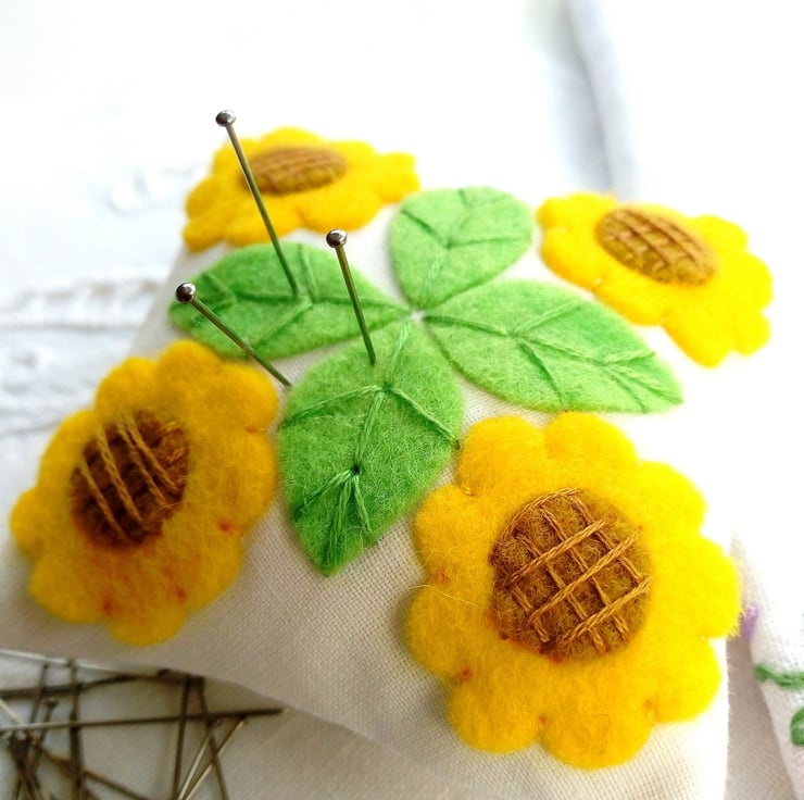 This pretty little pin cushion, designed and handmade by myself, features a vibrant symmetrical sunflower design.