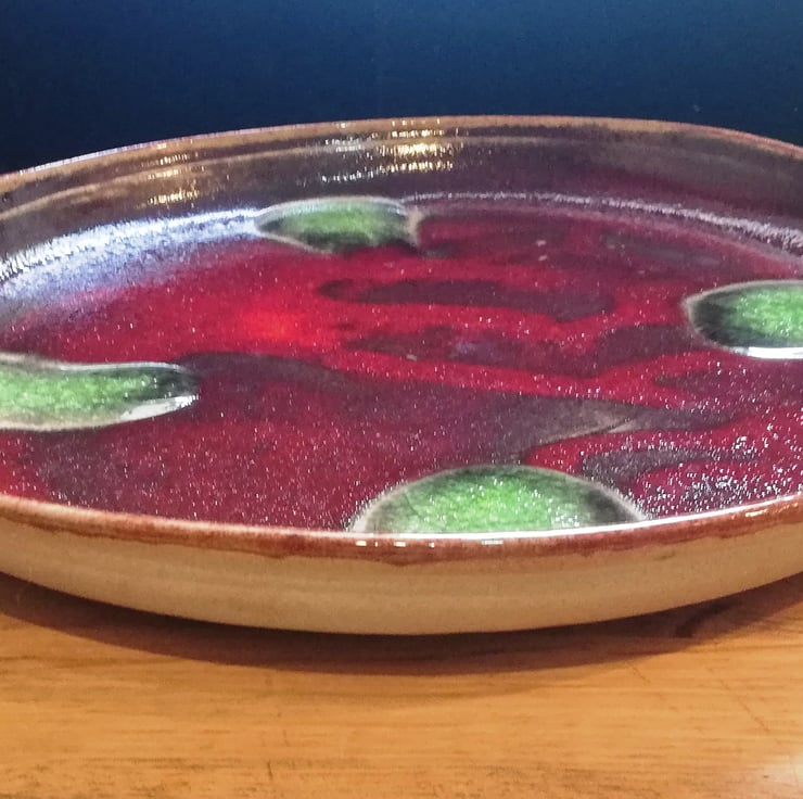 A gorgeous crackle and drippy, red glazed stoneware plate with 4 melted green glass beads on the four edges.