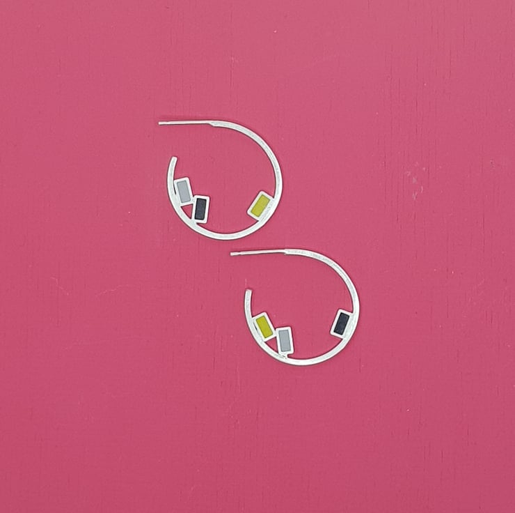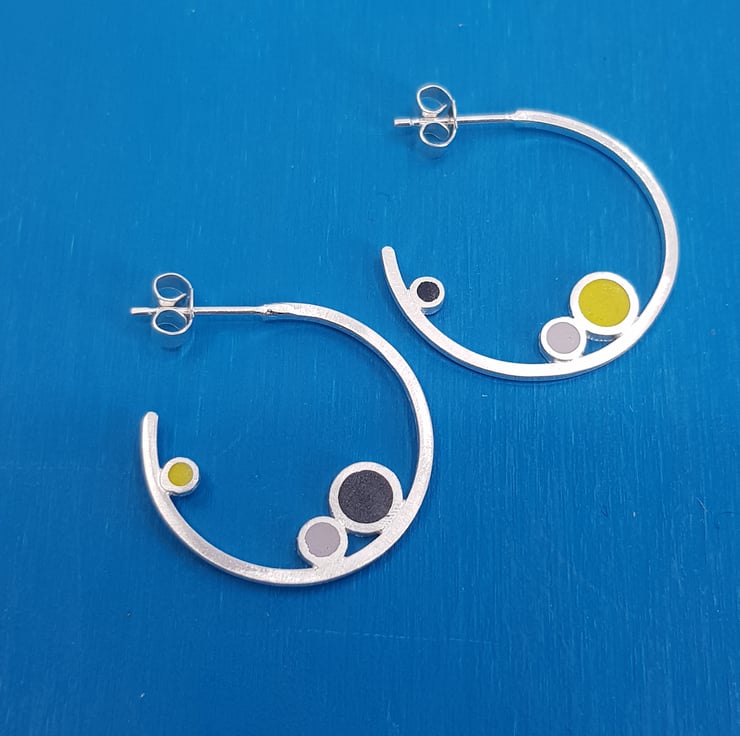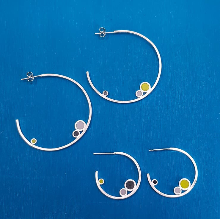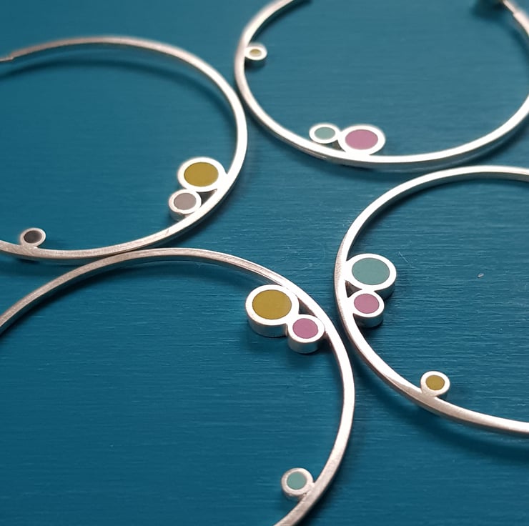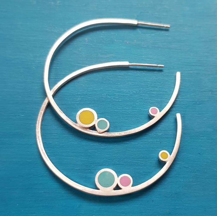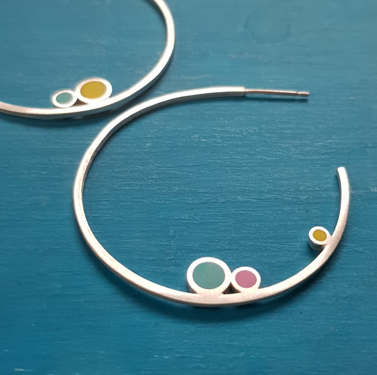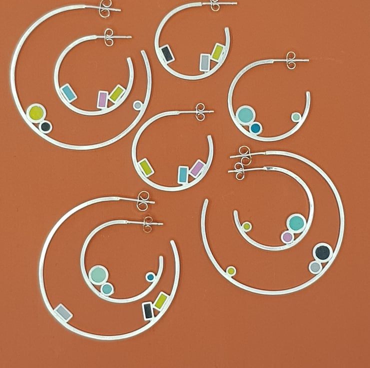 My Colourful Inside Dot Hoop Earrings are made from recycled sterling silver wire and I have soldered little shapes inside the hoops and filled the shapes with custom coloured resin clay.
