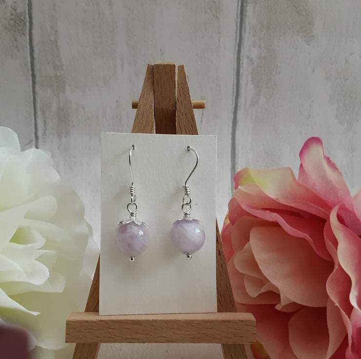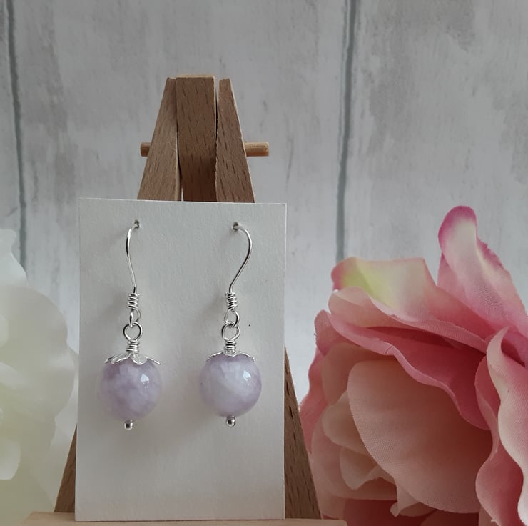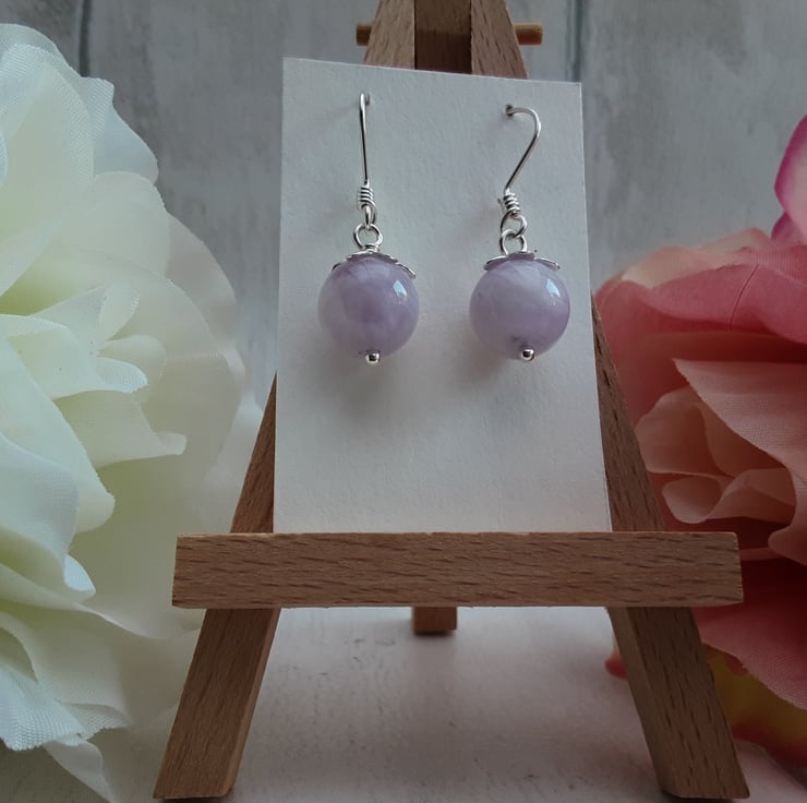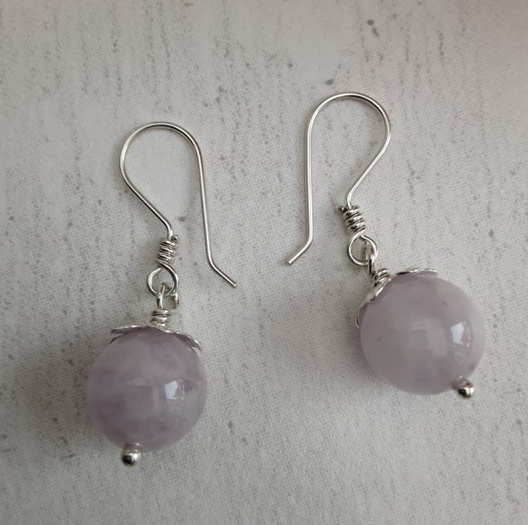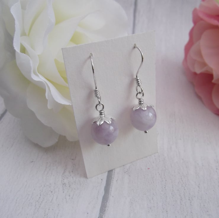 These elegant but simple dangle earrings have been made using 12 mm lavender amethyst beads, sterling silver bead caps and sterling silver wire.