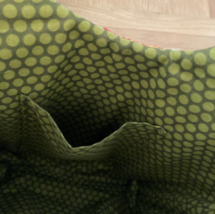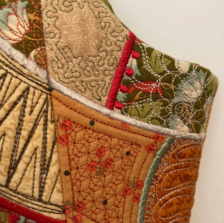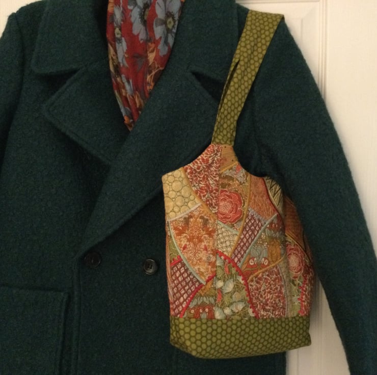 Medium sized embroidered quilted handbag. I have used Kaffe Fassett fabrics for the main embroidered areas. Fully lined with a contrasting fabric, which is used for the straps, and base. Each area is quilted in a different design and colour. The bag is lined, and has a large zipped pocket, and a phone pocket. This is a one off design, and cannot be repeated in the same colourway. 20ins high, 12.5ins wide at the widest point.