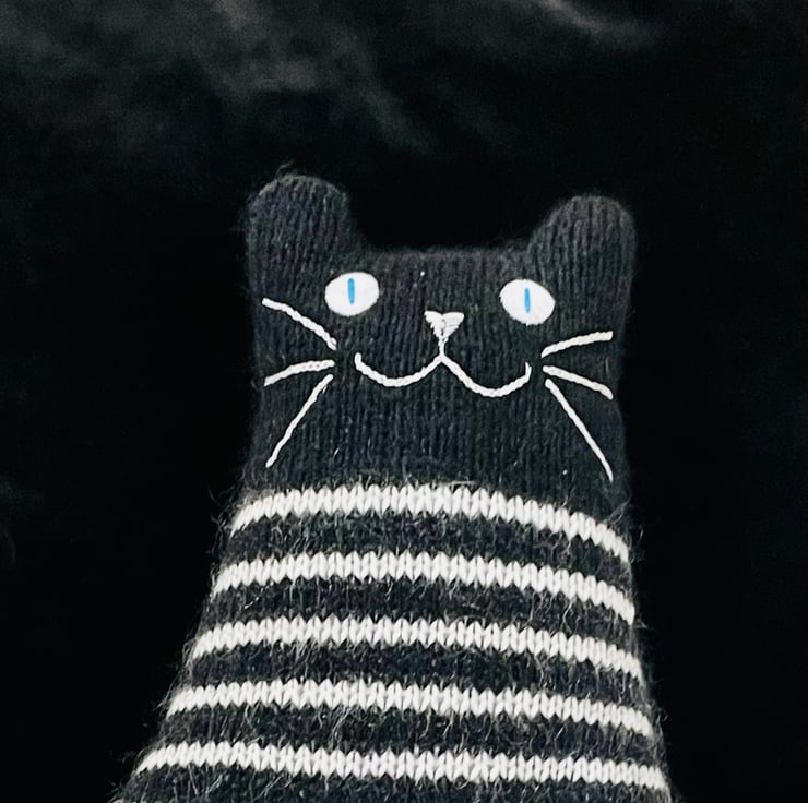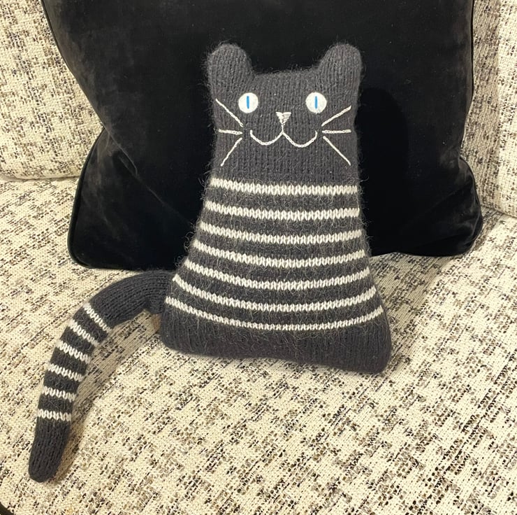 Our black and white cat is hand knitted from mixed mohair yarns filled with safe soft toy stuffing. The whiskers and face are made from cotton thread and eyes are made from felt.