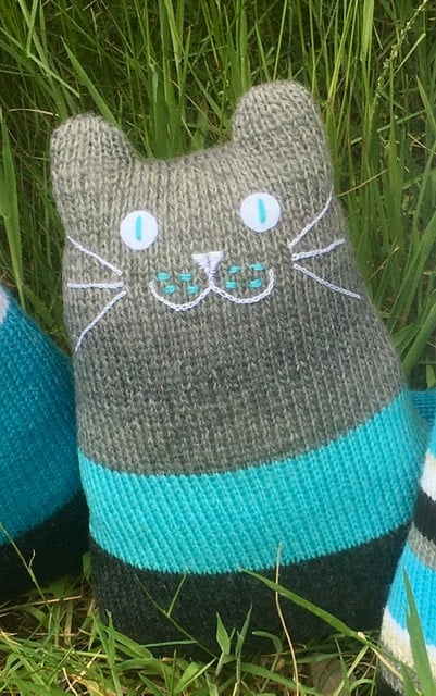 Lovely cat made from real wool yarns in turquoise blue and dark and pale grey..