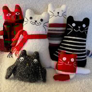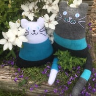 The cat is hand knitted and is filled with safe soft toy stuffing. The whiskers and face are made from cotton thread and eyes are made from felt.