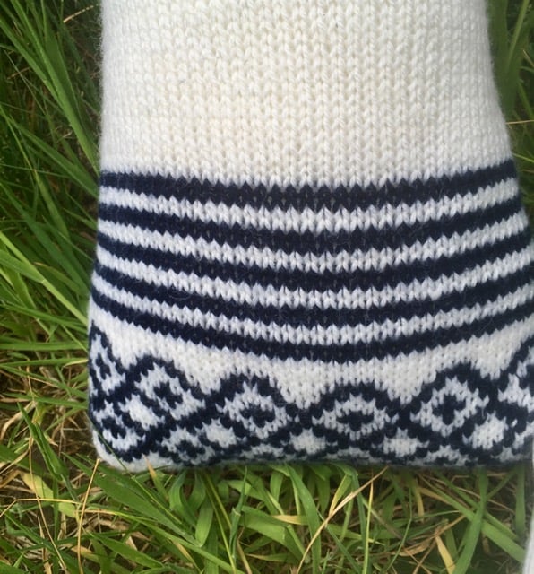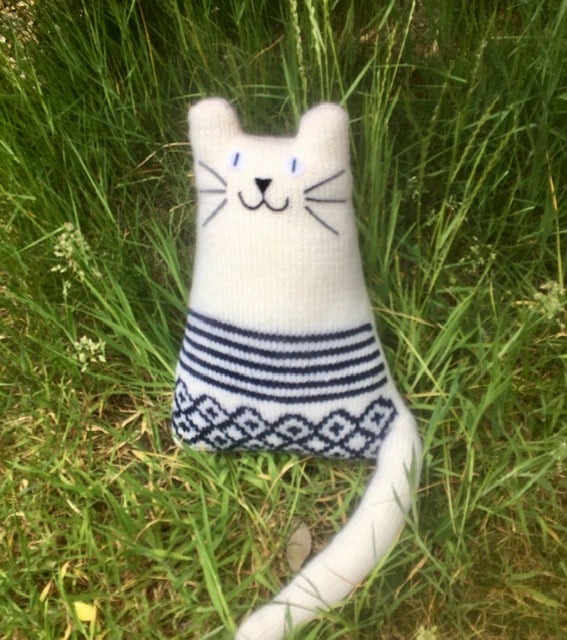 The cat has a Scandinavian style pattern at the lower part of the body - knitted from navy blue wool.