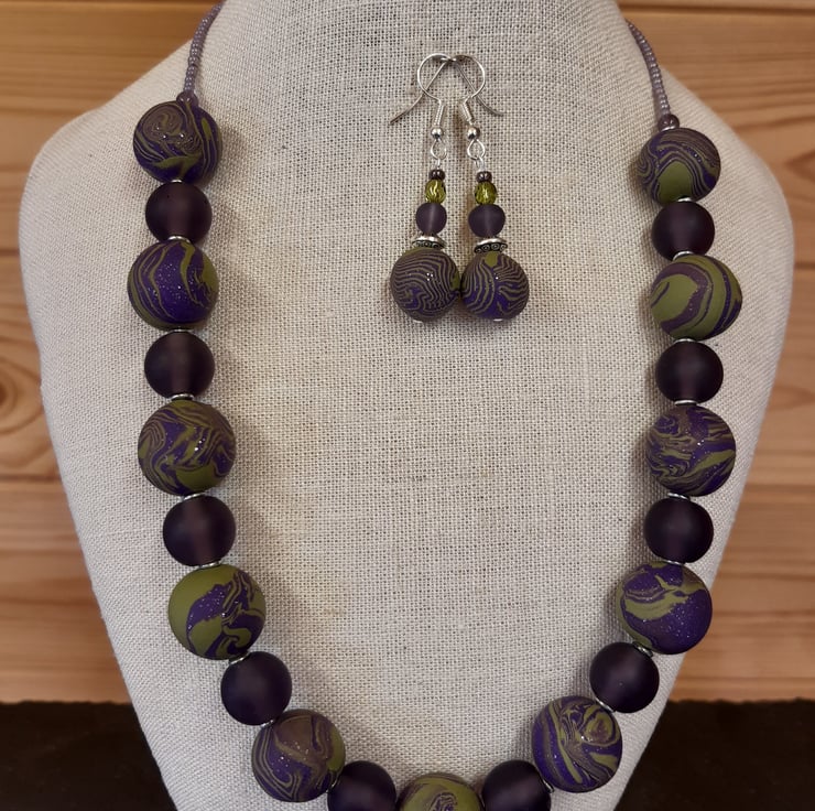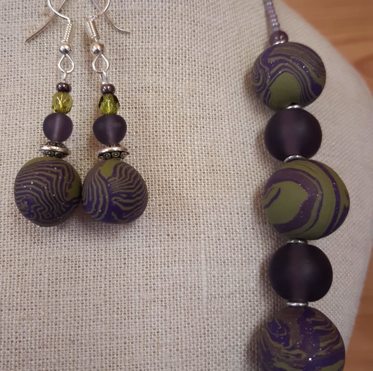 A beautiful necklace and earring set handmade from sage green and sparkly purple polymer clay. These handcrafted beads measure approx 16mm and have 12mm opaque purple round beads between them with tiny silver coloured disc spacers. The overall length of this attractive necklace is 47cm/18.5 inches