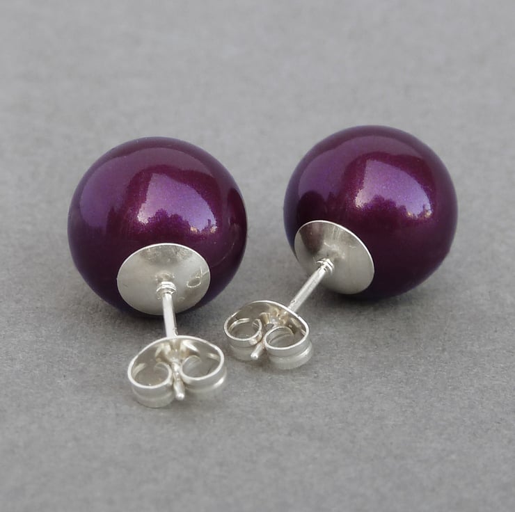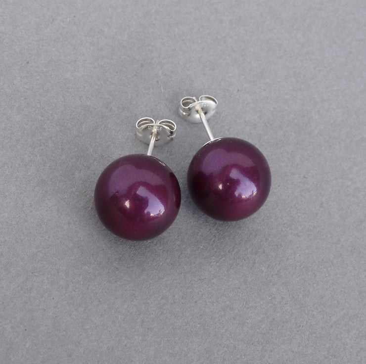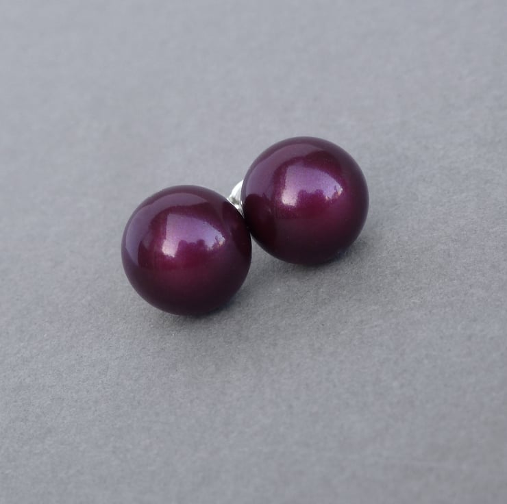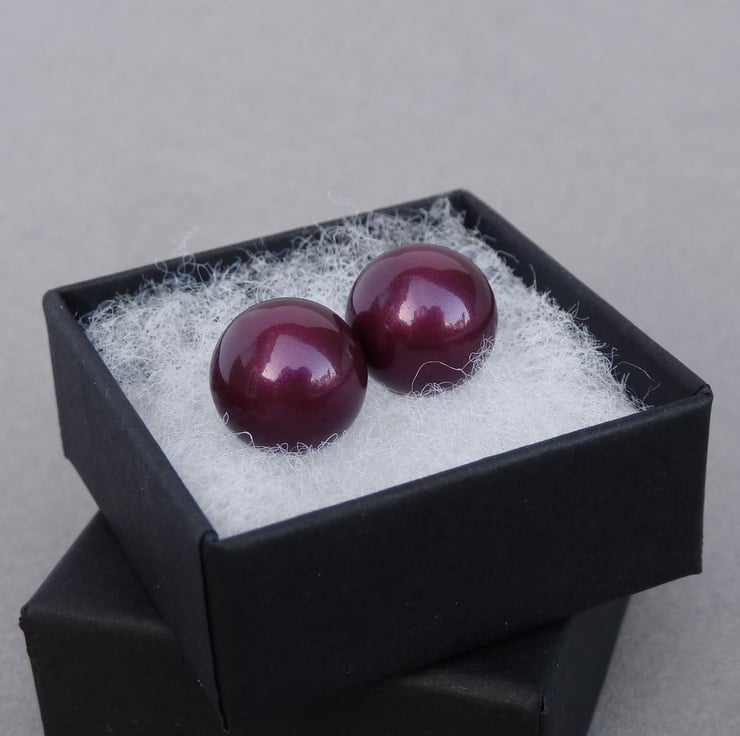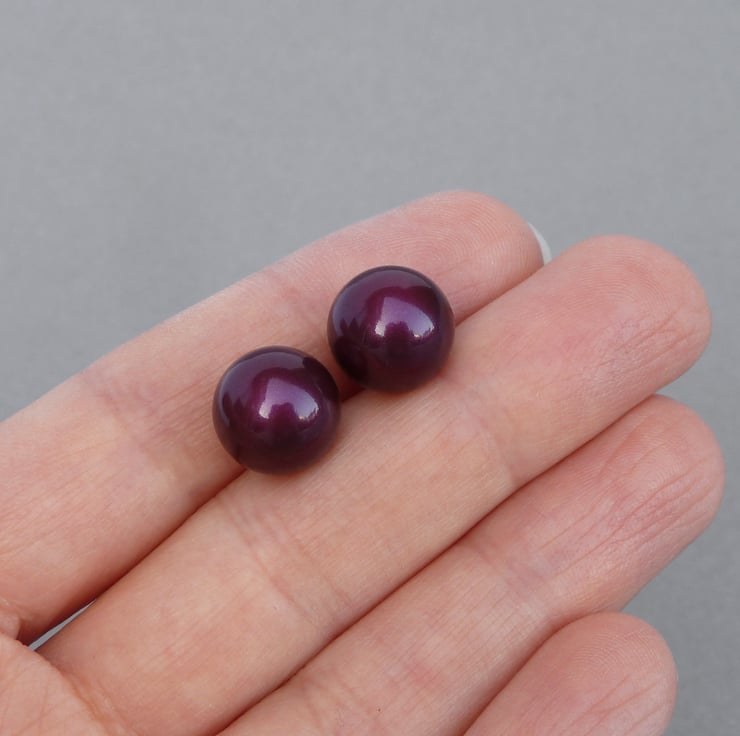 This round pair of round pearl stud earrings has been created using 12mm blackberry Swarovski pearls. Each pair of these plum glass pearl studs arrives individually gift wrapped, making these large earrings a perfect gift for bridesmaids or somebody special.
