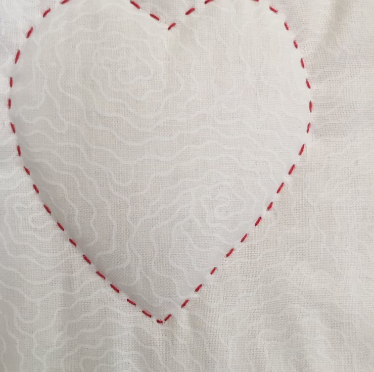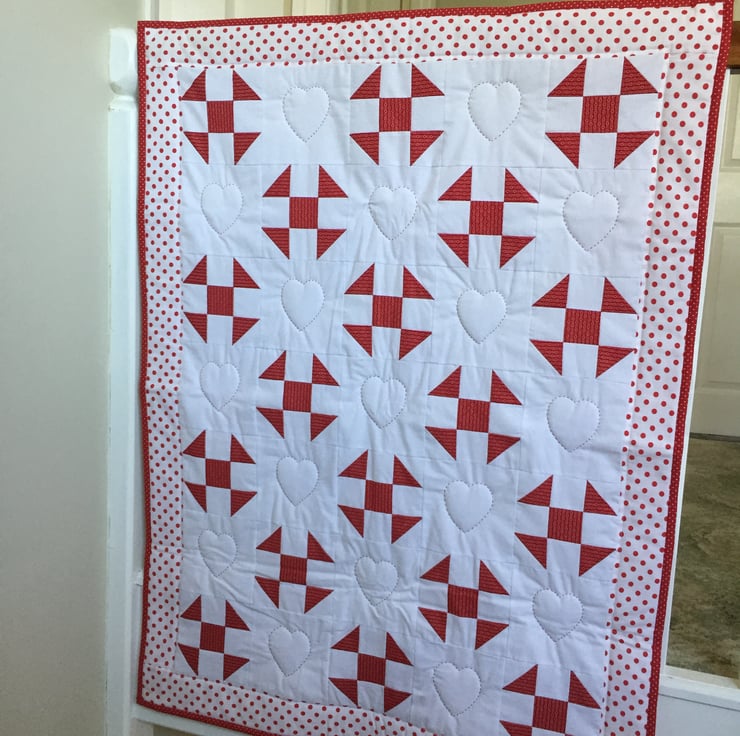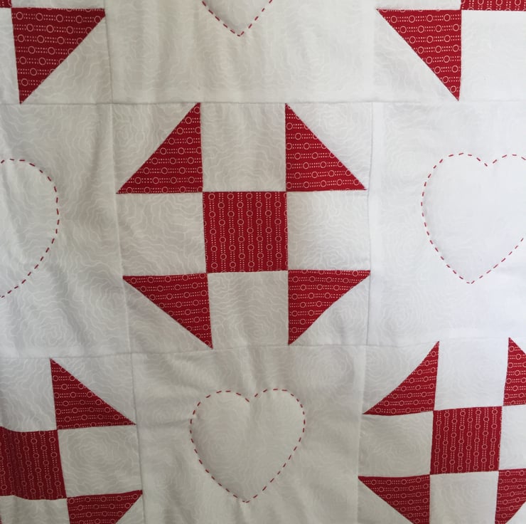 This patchwork quilt has 35 six-inch blocks (5x7) using a nine-patch method of construction with squares and triangles to form the “shoofly” blocks (18) in red/white cotton and white self-patterned cotton. The pieced blocks have been alternated with white self-patterned squares (17) which have been quilted in red embroidery cotton with a heart motif. A medium red and white spotted cotton has been used for the 3” (8cm) border on all four sides.