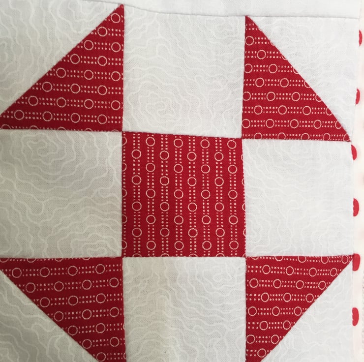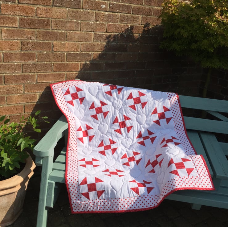 The backing of the quilt has also been completed in the medium red and white spotted cotton. The double thickness hand finished binding is a red and white small spot cotton and a light polyester wadding has been used between the layers.