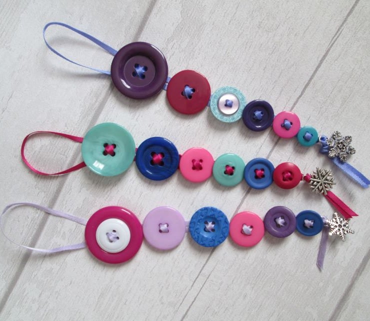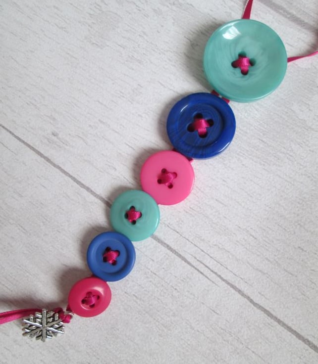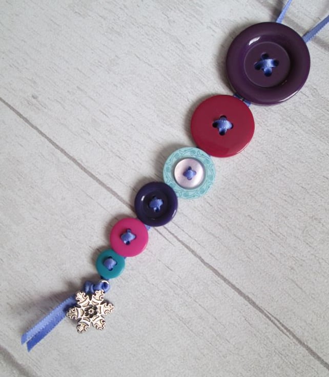 If your Christmas colour scheme is geared more to frosty pinks, purples and blues, this trio of button decorations may be just what you're looking for. Graduated sets of buttons, threaded on to satin ribbon and finished with pretty snowflake charms. Each dangle is about 15 cm from top to bottom, not including the hanging loop.