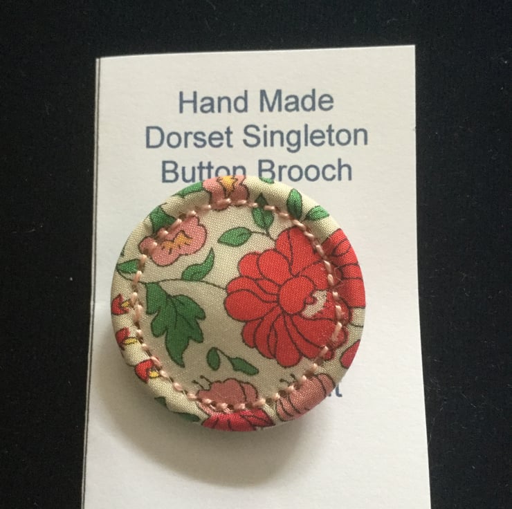 This brooch is made from an early type of traditional Dorset Button known as the Singleton. What makes this brooch special is that the fabric used in its construction is a Liberty print fine cotton lawn in the design ‘Danjo’ with stitched detail worked in toning pale pink cotton.