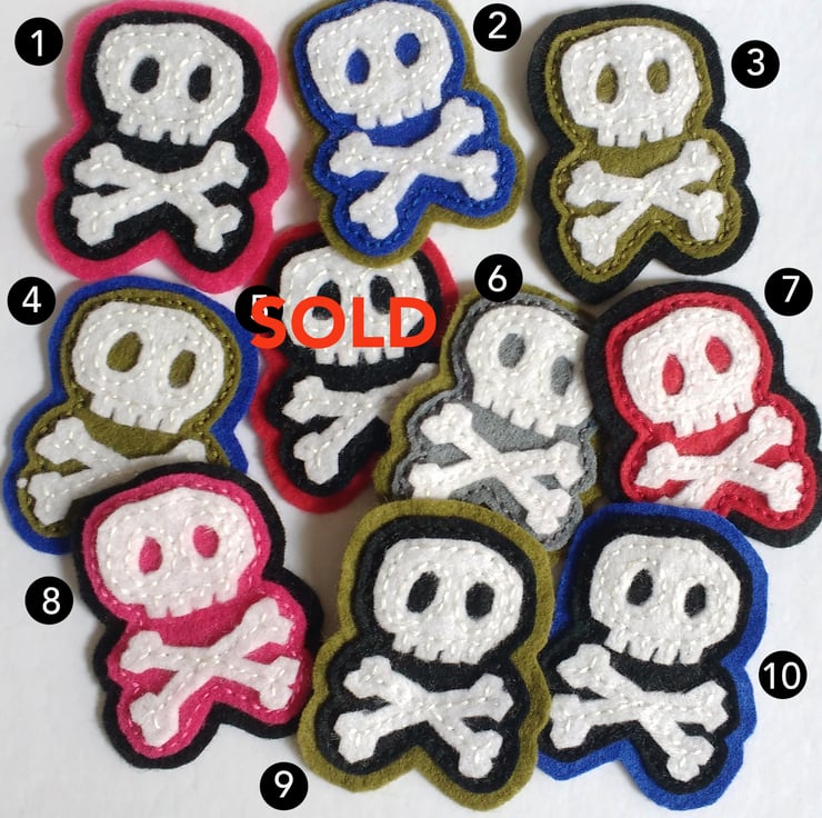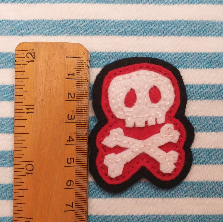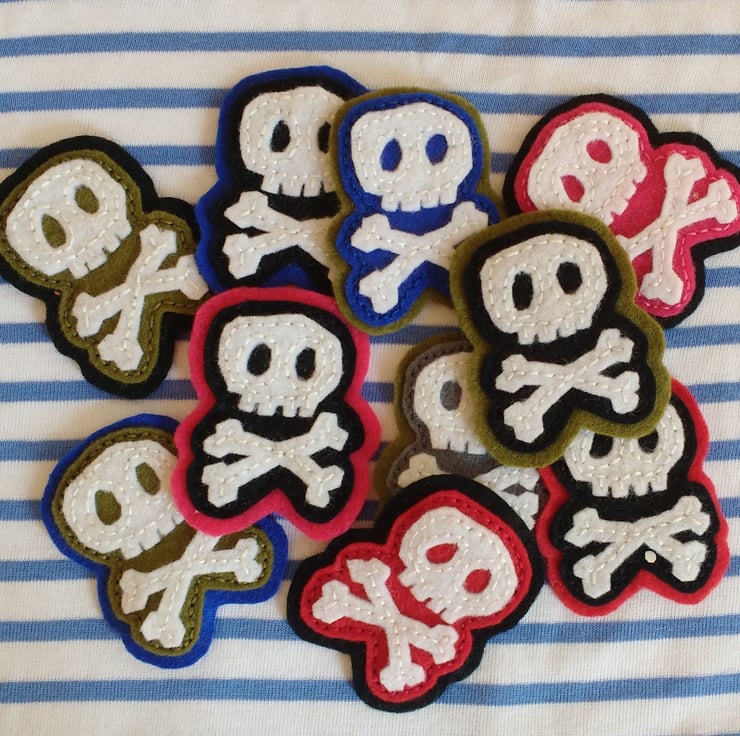 Hand stitched little felt brooches, white skull & crossbones motif on red, black, blue, khaki, grey or pink backgrounds. On the reverse is a small safety pin, to secure the brooch/badge to clothing, hats or bags.