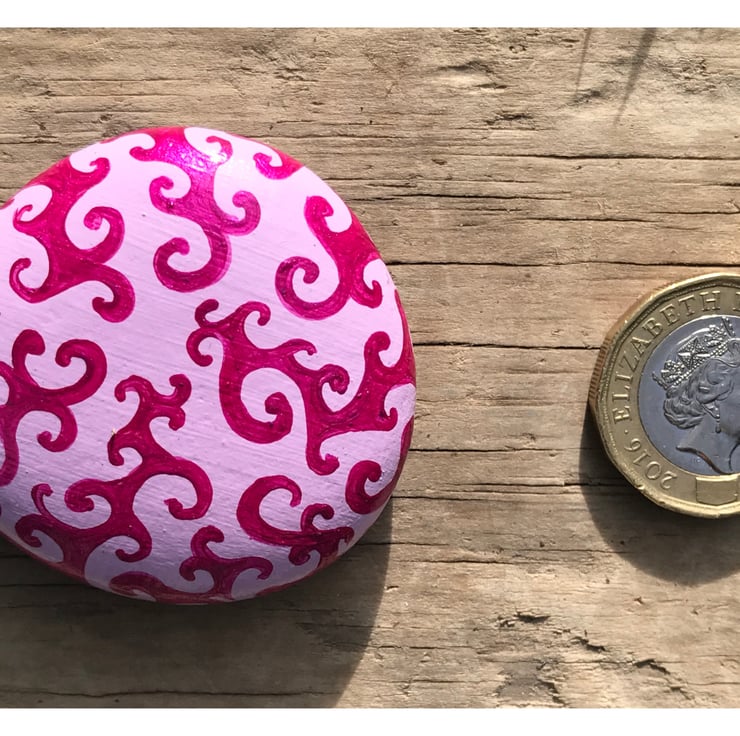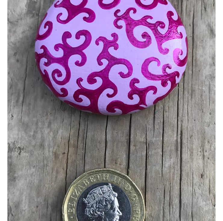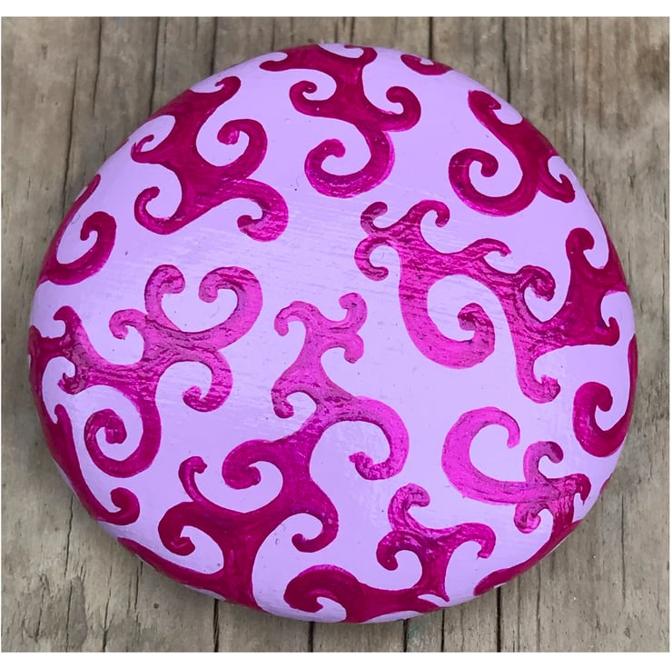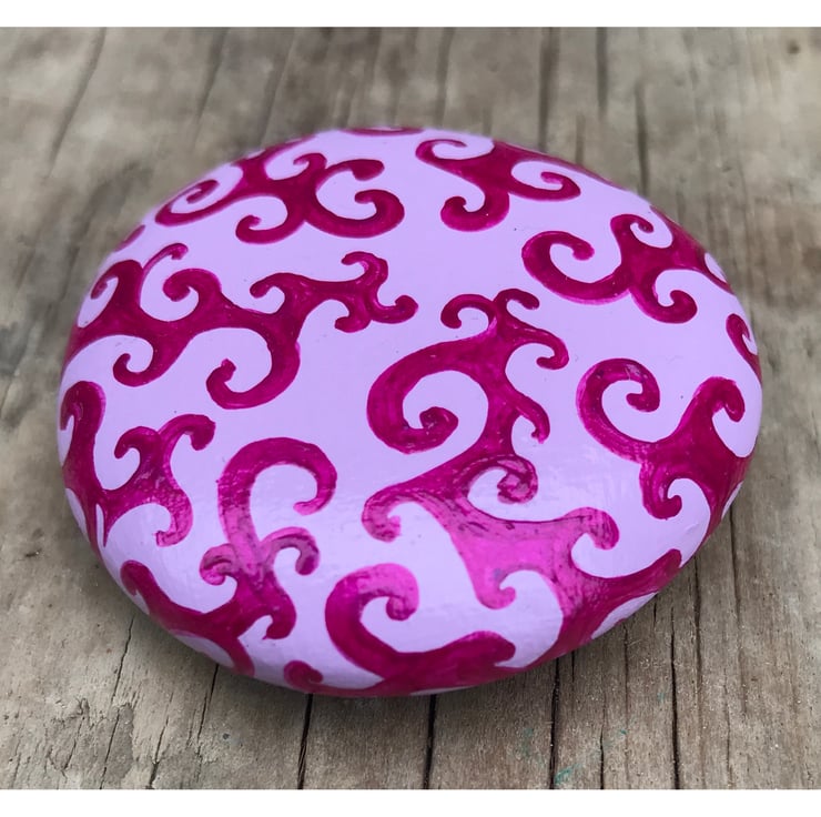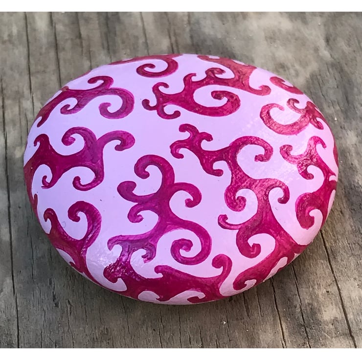 A sea-worn pebble pained with dark pink/violet culicues on a pink background.
