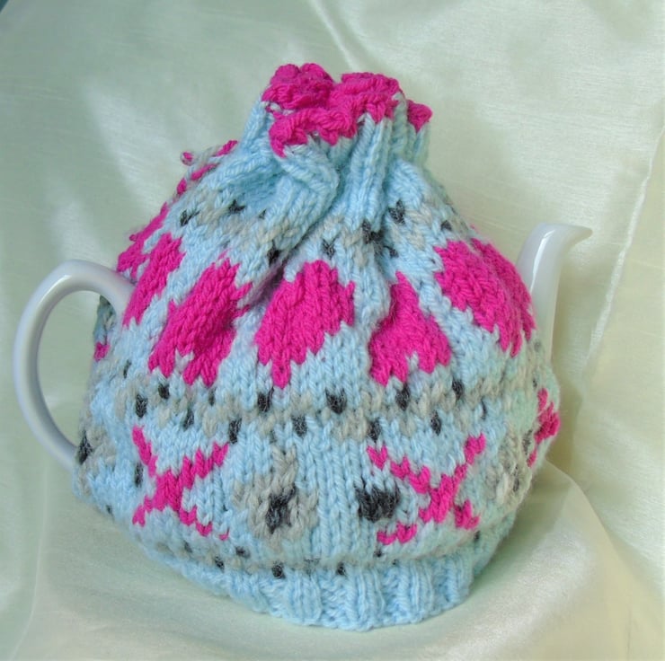Duck egg blue cosy with a intarsia pattern of hearts and crosses in vibrant pink, black and grey. Draw string top.