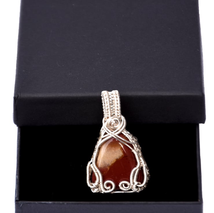 This beautiful pendat is wrapped in tarnish resistant silver plated wire; with a swirly motif.