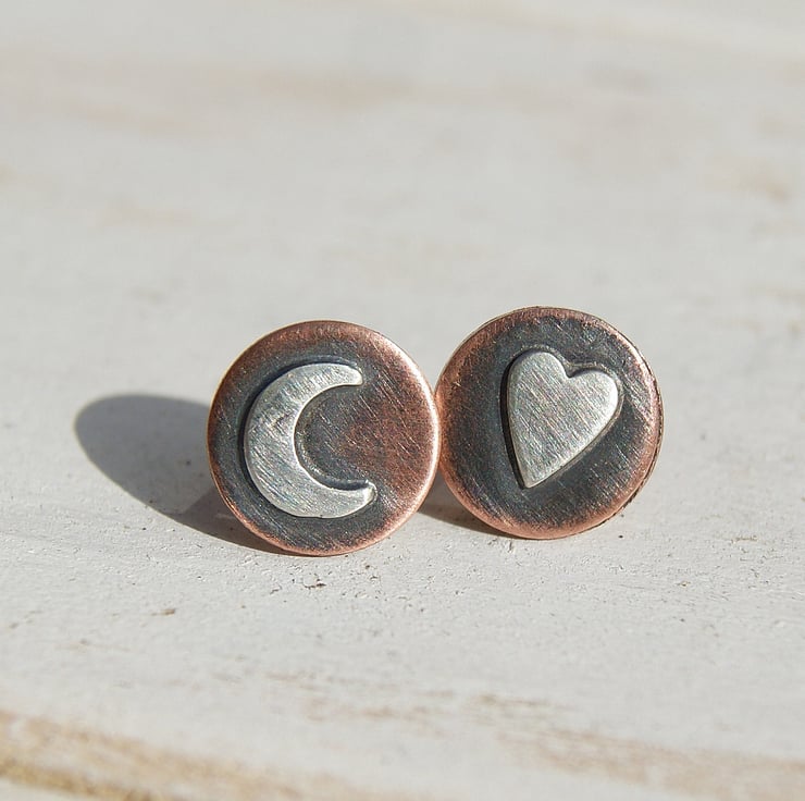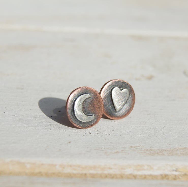 Copper and Silver Stud Earrings, Oxidised Heart and Moon Studs