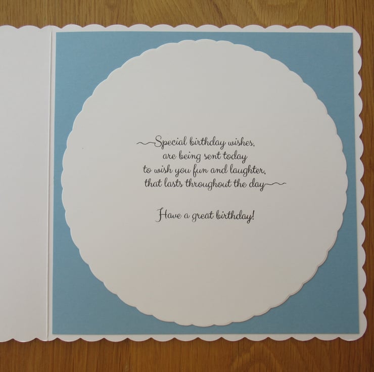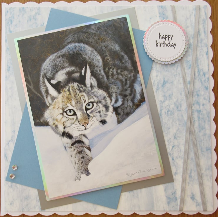 This 8 x 8 inch card features a stunning Lynx creeping through the snow by the artist Pollyanna Pickering in soft blues and greys. It has several layers including one of silver mirror card to catch the light and is mounted using 3D foam for that extra touch of luxury. It is finished off with a double ribbon down one side of the card and some gems to accent one corner of the image. The inside of the card is finished off to match the front along with a stamped birthday verse as pictured.
