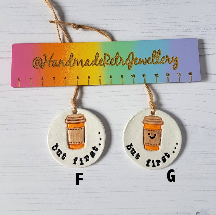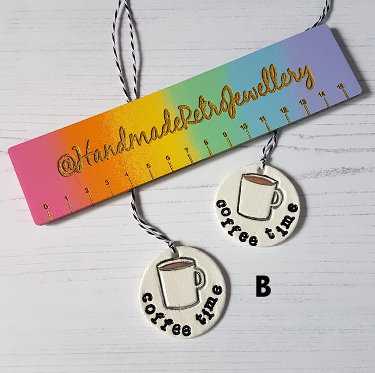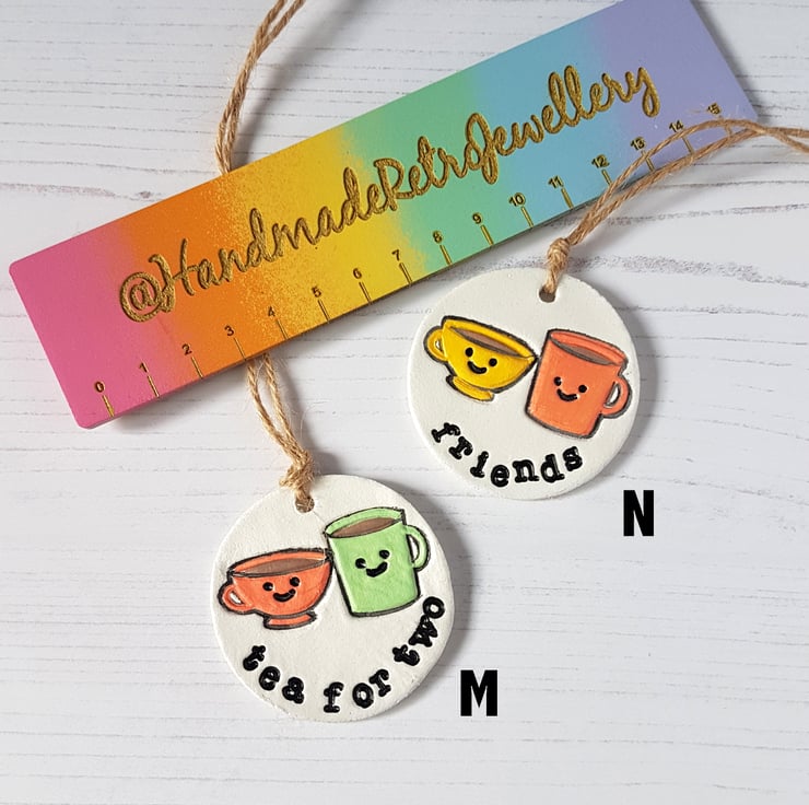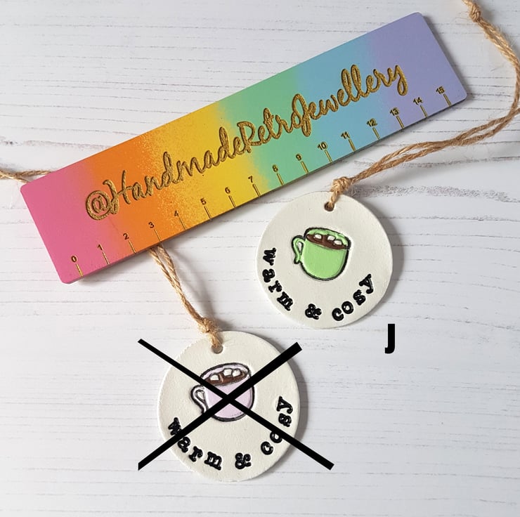 The design is hand stamped into air dry clay, then finished off using a dryer, and finally hand painted detail added using acrylic paint. The piece is then sealed with a varnish to protect, with some baker's twine added to hang in your home!