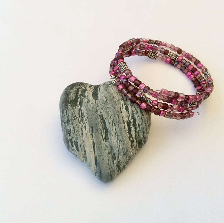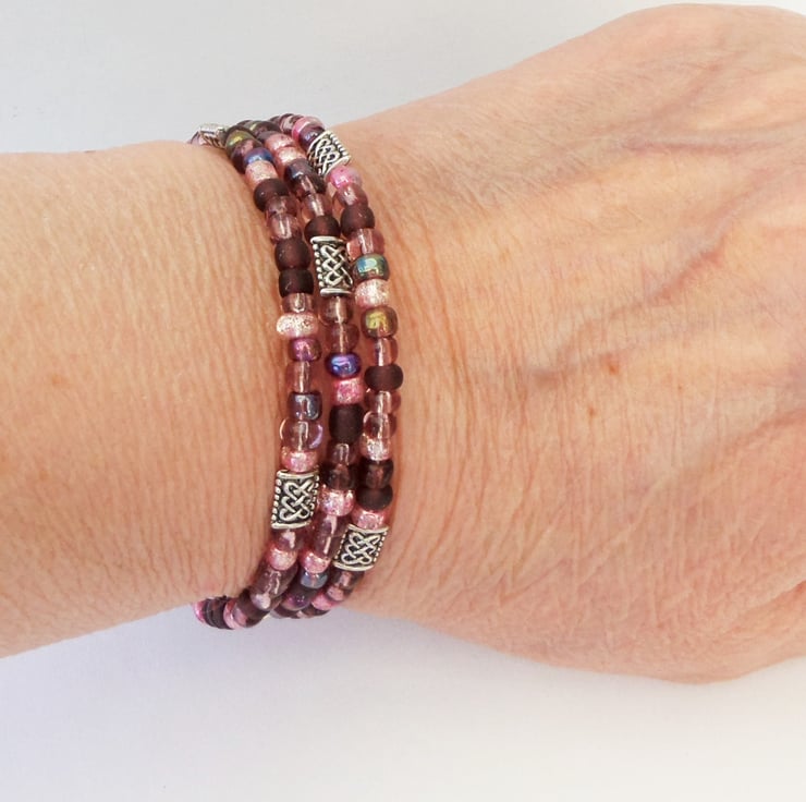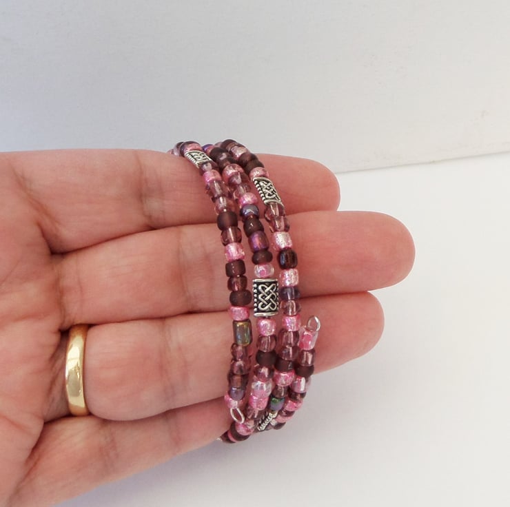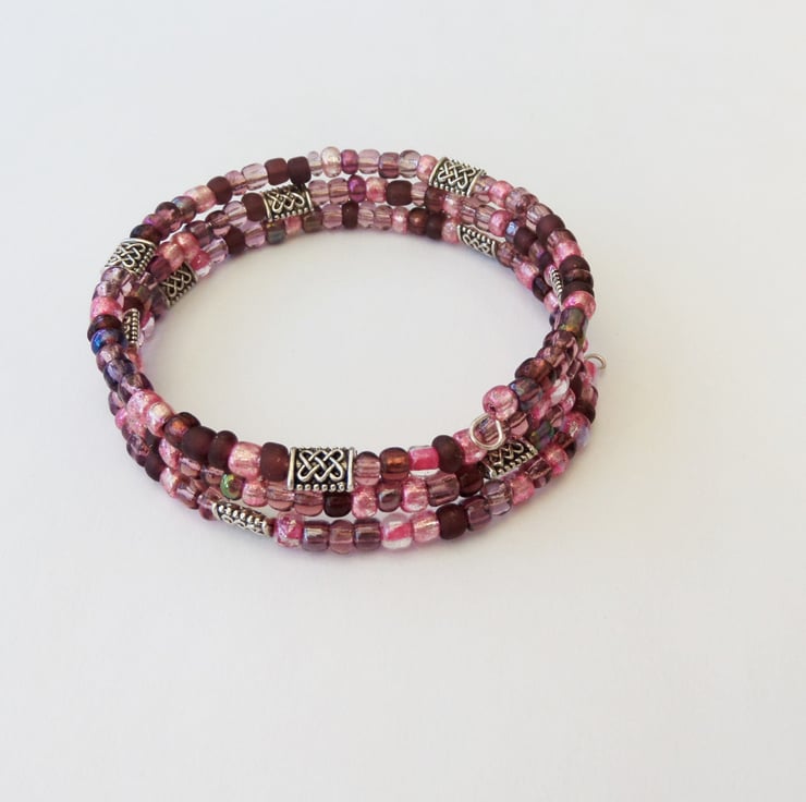 Memory wire bracelet made using mixed pink seed beads and Tibetan silver Celtic knot beads. Approx 3 coils.