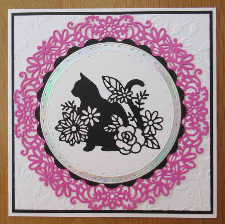 This pretty 7x7 inch card features the silhouette of a cat and some flowers in black, white and pink. It has several layers including one intricate circular floral die and one silver rainbow mirror card to catch the light and has an embossed white card in the background. It's quite simple and I didn't put Happy Birthday on the outside as I felt it didn't need it but I can add it if required. The inside is finished to match the front with a pink border and a simple Happy Birthday greeting.