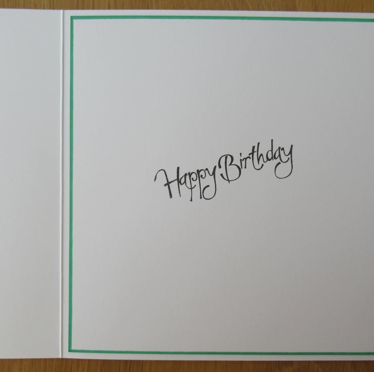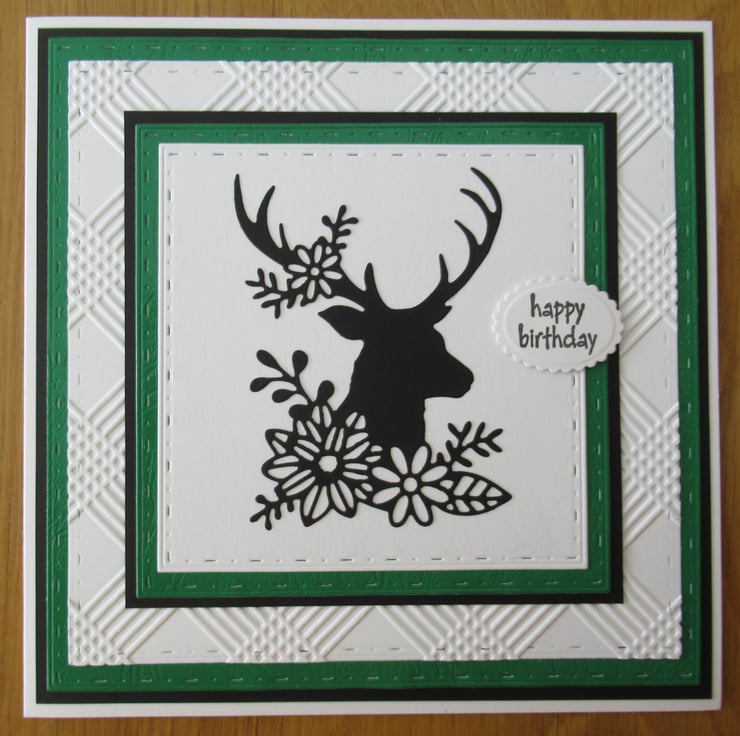 This pretty 7x7 inch card features a die cut silhouette of a stags head and some flowers in black, white and green. It has several layers including an embossed white card in the background. The inside is finished to match the front with a green border and a simple Happy Birthday greeting.