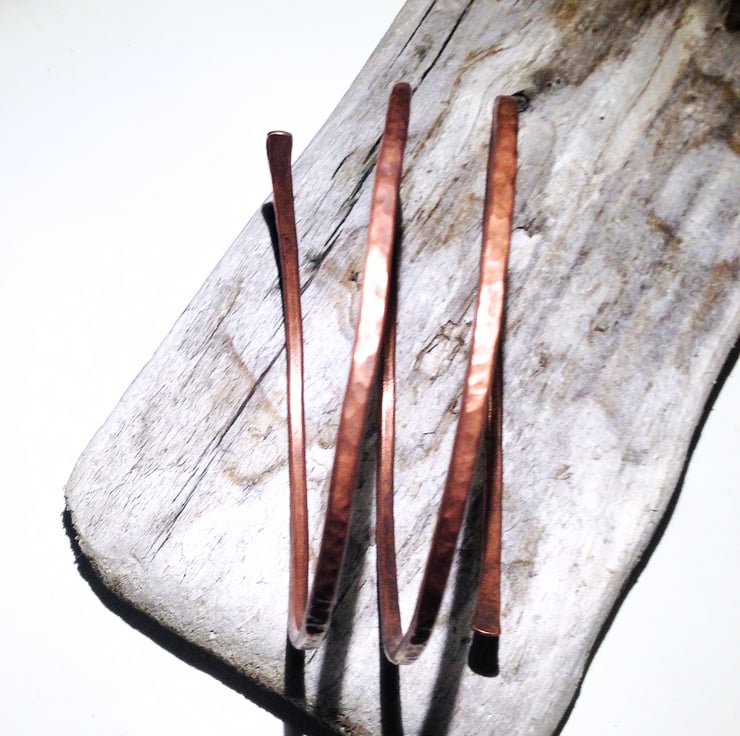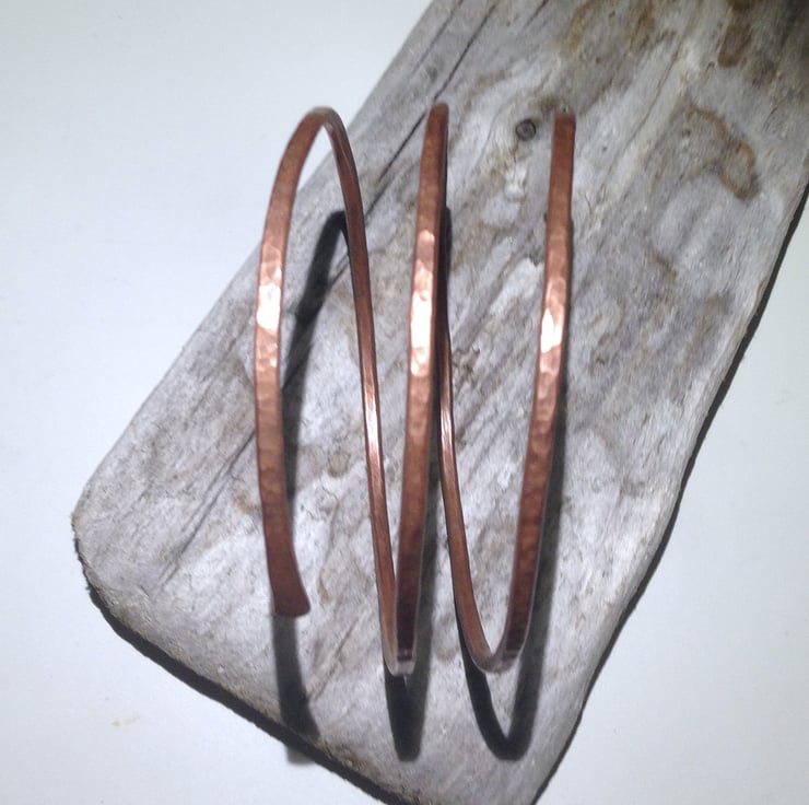 It has been crafted from 2.5 mm copper. has an inside diameter of approximately 7.25 cm and as it is an open bangle it can be adjusted to a degree.