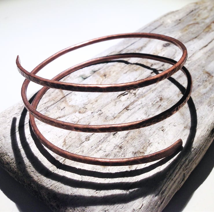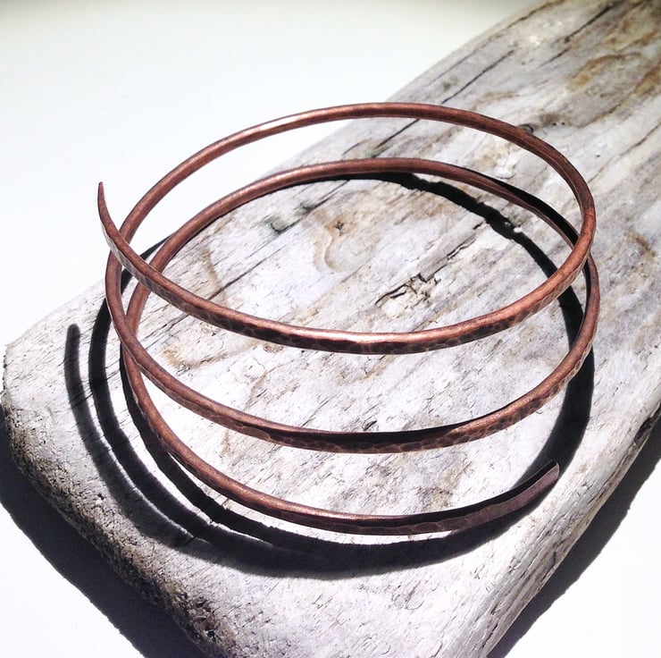This lovely bangle has been handcrafted from copper in a wrap round spiral design. It has been given an attractive hammered finish then polished, oxidised and rubbed back to for an aged look.