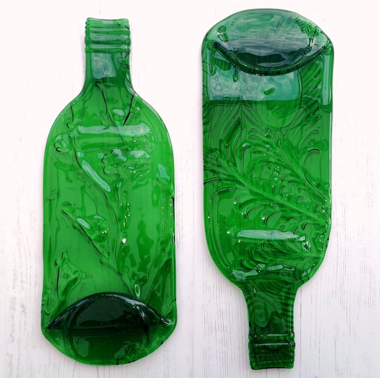 ‘Squashed’ bottle, made from recycled glass that has been melted to make a flat serving plate. A perfect upcycling, zero waste eco gift – reclaimed bottles transformed into environmentally friendly tableware.