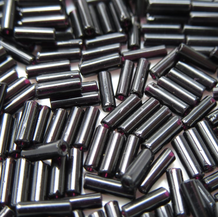 Black bugle beads, deep purple against a bright backlight.