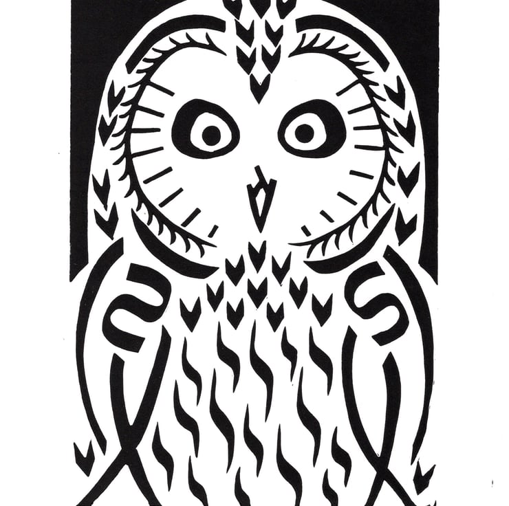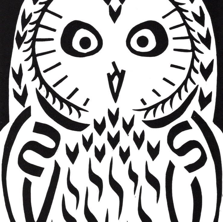 A mysterious figurative Short-eared Owl linocut print from my series of 'Five English Owls'.