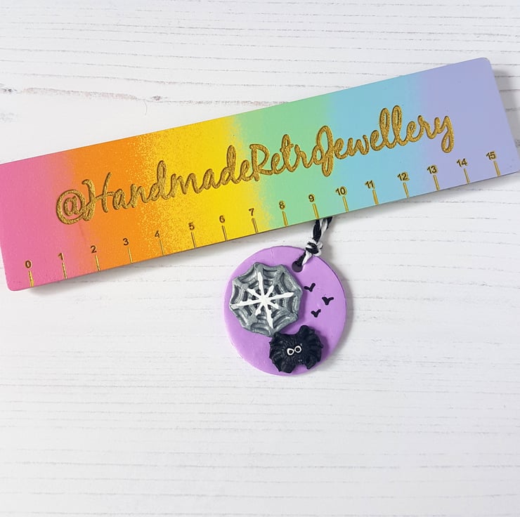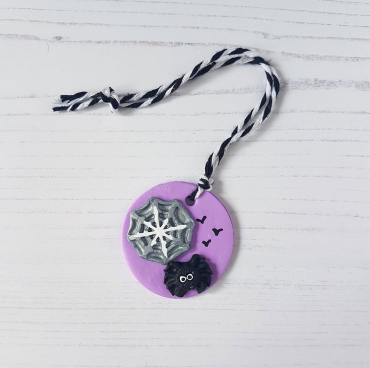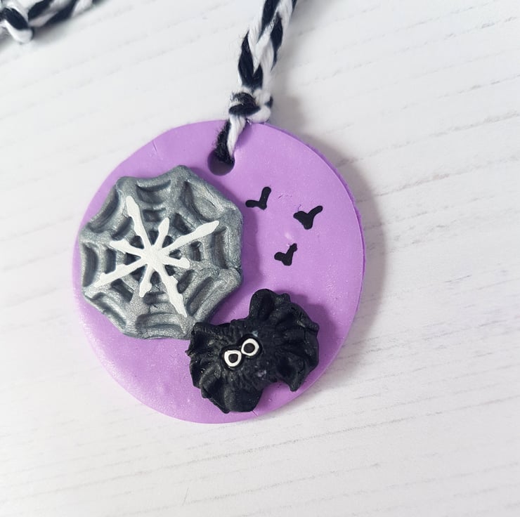 These lilac glittery decorations are made of polymer clay, with a black spider and silver web placed onto the top, to create a 3D effect. Detail is hand painted using acrylic paint to finish, with the addition of some flying bats!