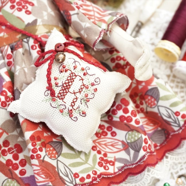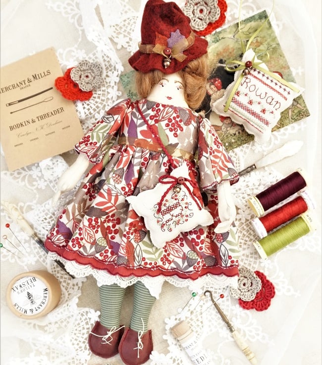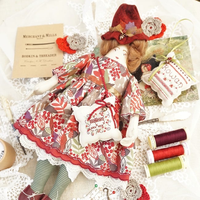 If you come from Lancashire and you make dolls, well you are going to make a witch doll. I love my little witch dolls, they are not remotely wicked just sweet hedge witches that are kind and gentle. Rowan is dressed in a pretty Autumn themed fabric with an oak leaf print and rowan berries.