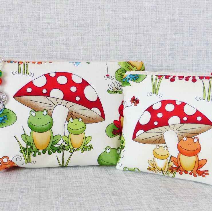 The main fabric has a toadstool and frog design in shades of red, green and blue on a cream background and it is lined with red cotton with a whte star design on it.