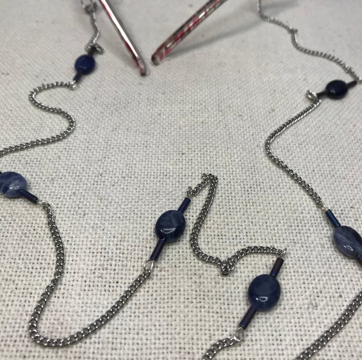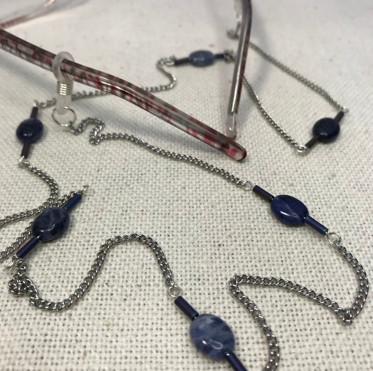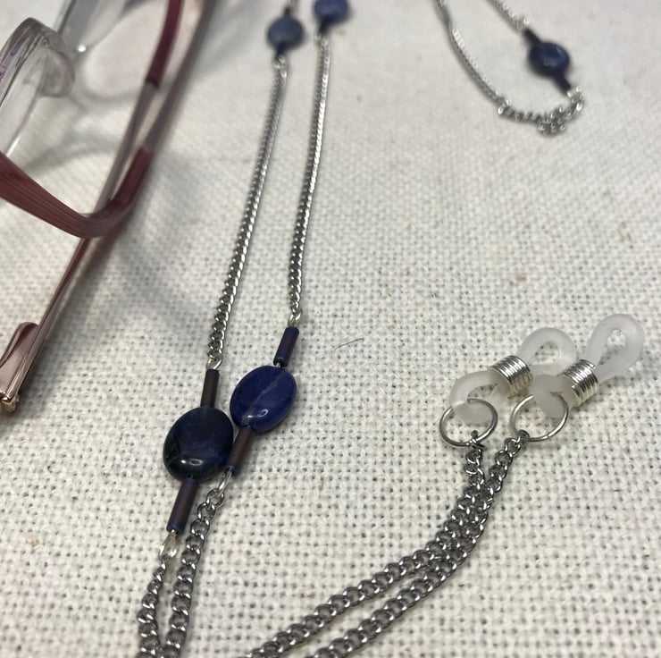 Spectacle/glasses chain in silver tone surgical steel with semi-precious Sodalite beads & glass bugle beads with clear rubber spectacle holder/ends. Never lose your glasses or sunglasses again! The perfect stocking filler or gift.
