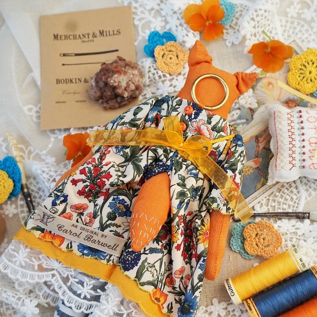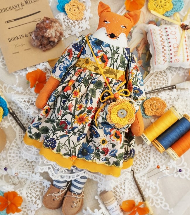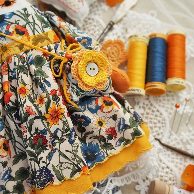 I have dressed her in an orange, golden yellow and blue cotton fabric by Liberty, it is a tana lawn called Rachel, a lovely late summer print with rich colours . The dress is covered in an organic pattern of summer flowers in this rich colourway. She has matching bloomers in cotton with underskirts in coordinating cottons and lace.