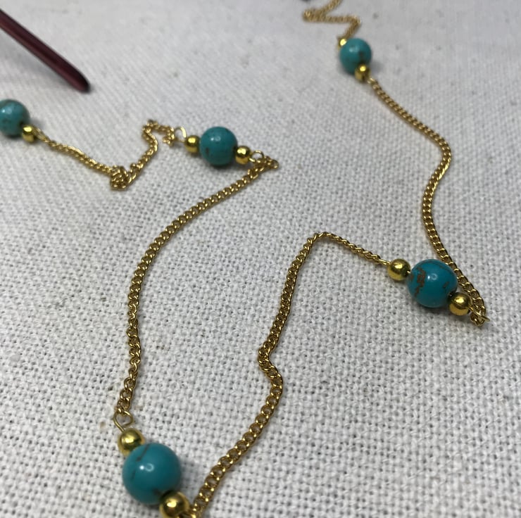 Spectacle glasses chain & sunglasses lanyard in gold tone surgical steel chain with Turquoise beads & gold plate spacer beads & black rubber spectacle holder/ends. Never lose your glasses or sunglasses again! The perfect stocking filler or gift.