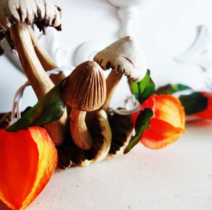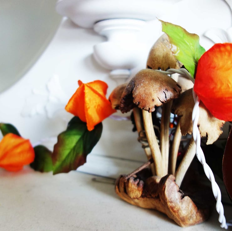 I adore orange lights for the soft warm comforting glow they impart to any room or setting you put them in. The magical Chinese lantern plant has pumpkin shaped pods that give out that glow, and with that in mind, I've crafted a set of string lights festooned with silk Physalis pods.